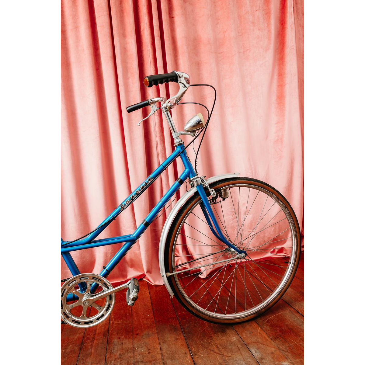 Cadre en acier laqué bleu, détails chromés, selles en cuir noir et garde-boue métalliques.