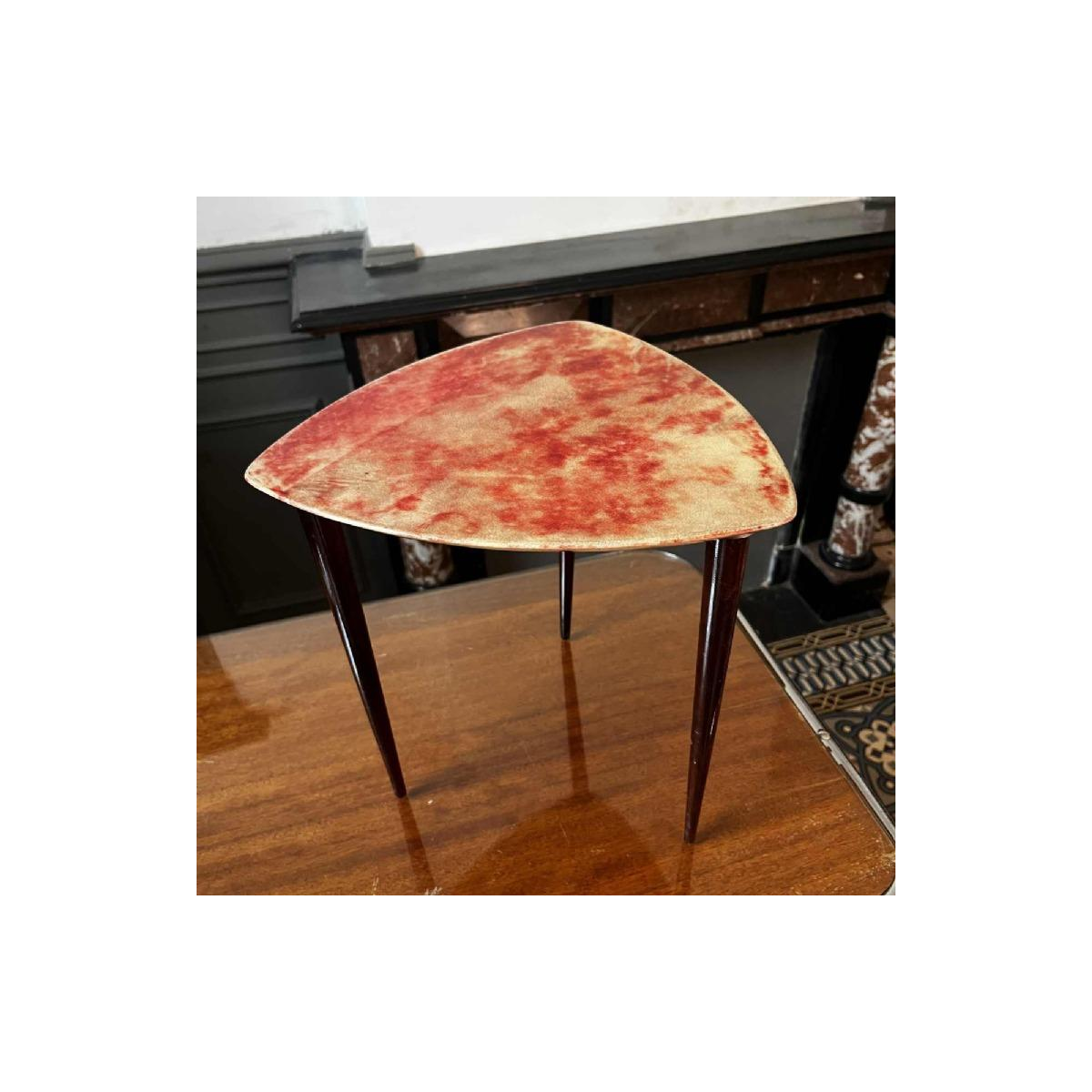 élégante petite table basse ou d'appoint tripode en parchemin peau de che`vre teinte´ rouge et laquée, créée par le designer italien Aldo Tura vers 1950.