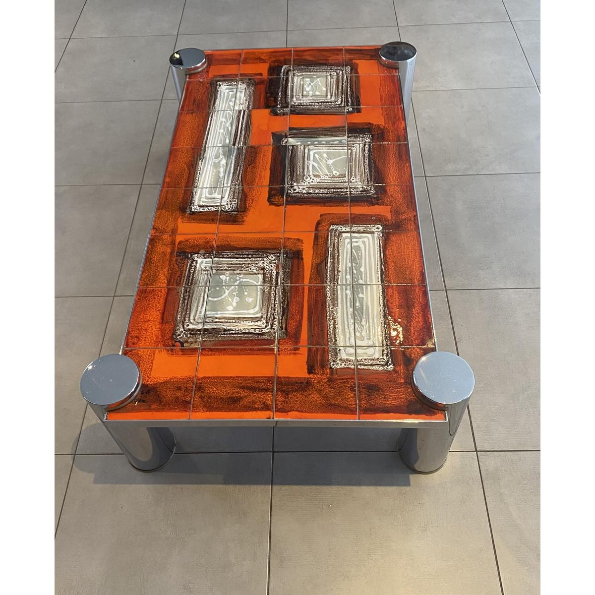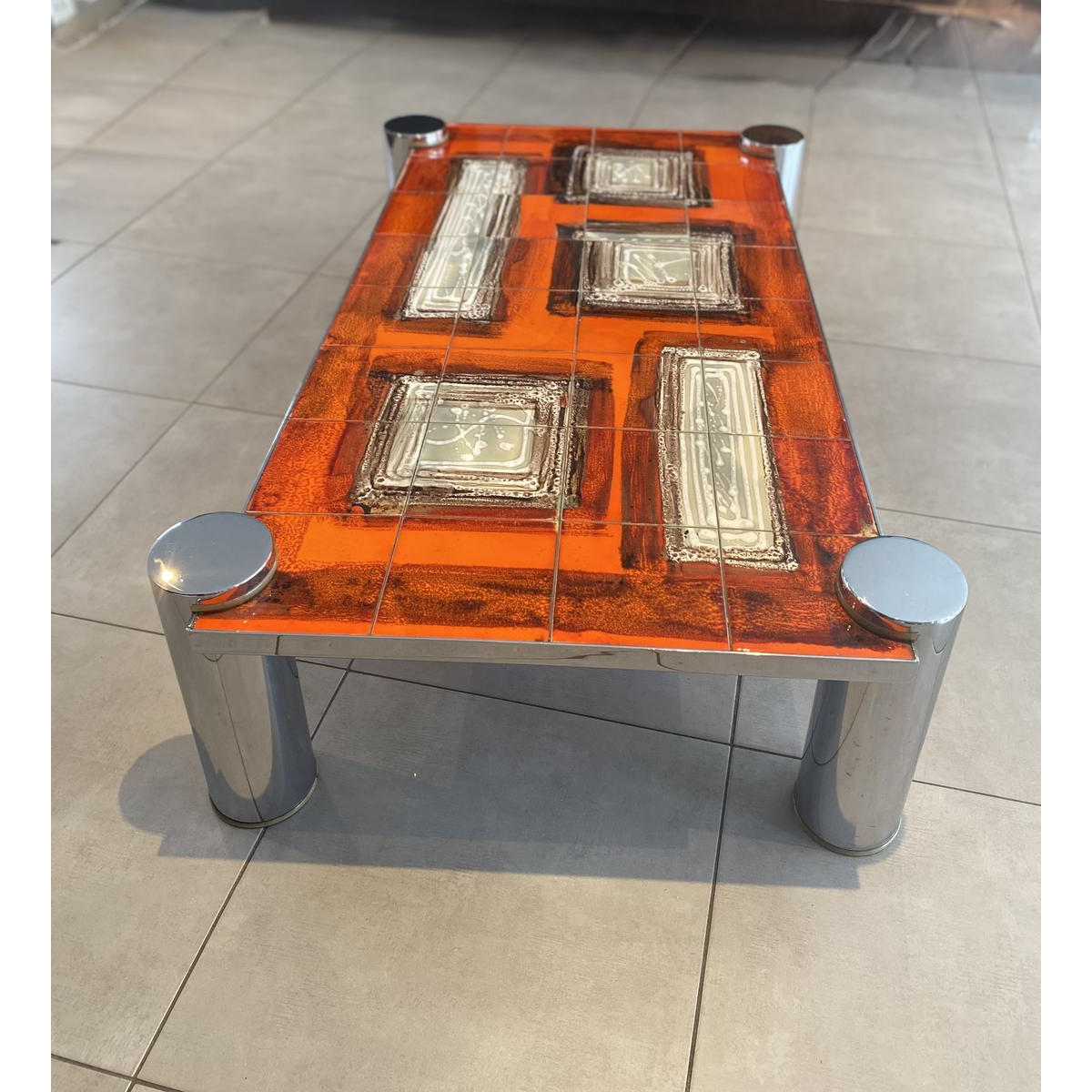 Table de salon rectangulaire, avec un plateau en carreaux de céramique orné de motifs géométriques beiges et bruns, structurés, sur fond orange. Les pieds sont formés de larges cylindres en métal chromé, ce qui lui donne une allure très contemporaine et rehausse sa beauté et son caractère affirmé.