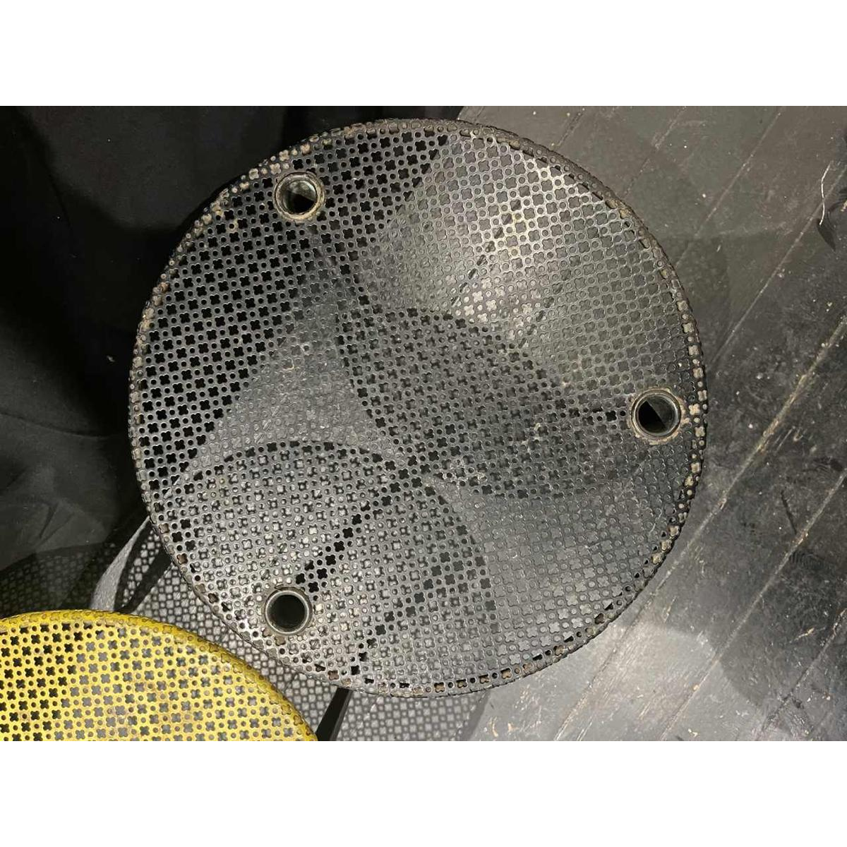 Suite de deux tables circulaires en métal perforé à motif ajouré de trèfles laqué noir et jaune.