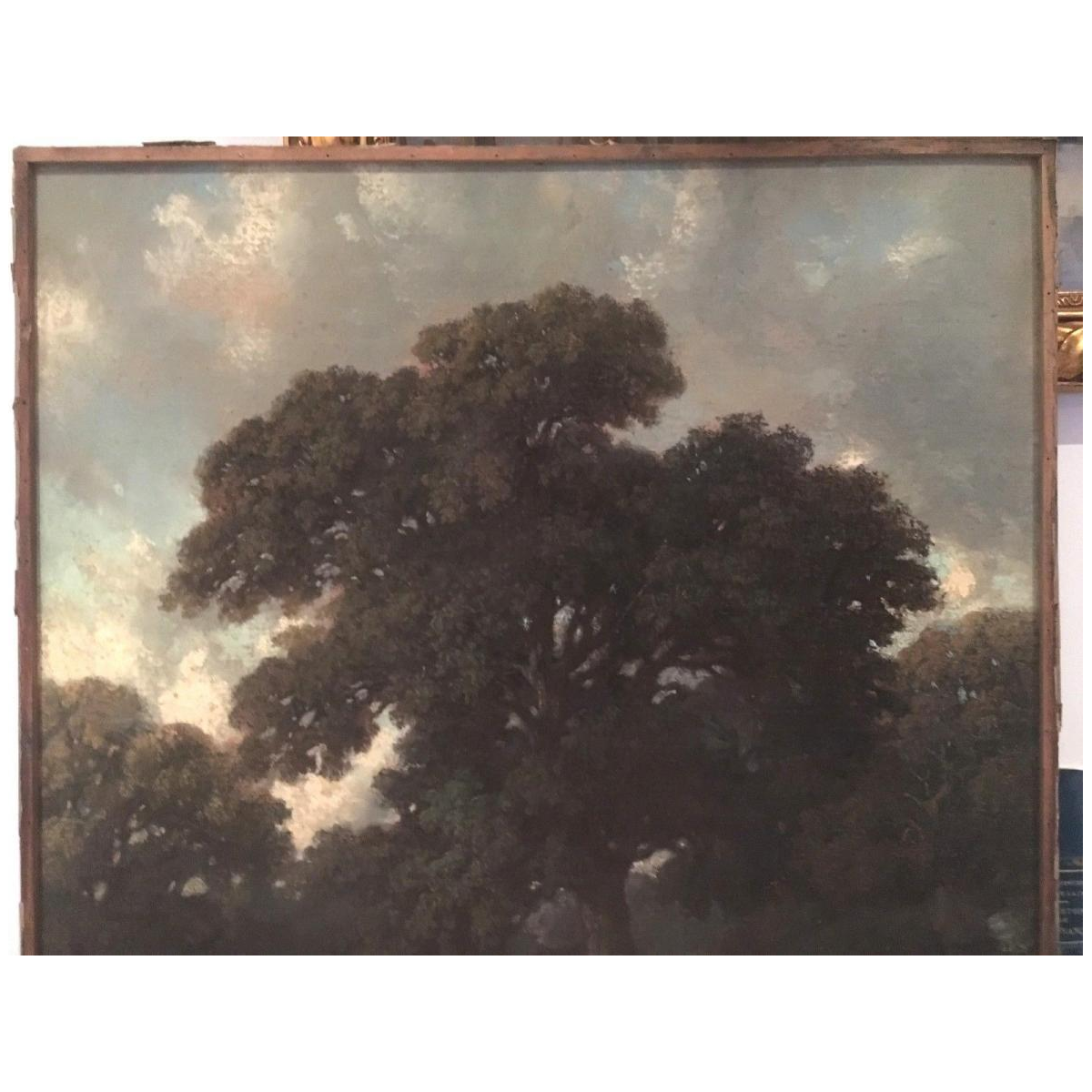 Très joli pastel ancien sous verre représentant un paysage boisé animé d’un troupeau de vaches au bord de l’étang.