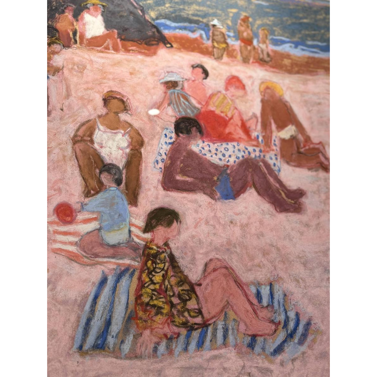 La composition montre plusieurs personnages disposés sur le sable face à la mer: femmes allongées, enfants, silhouettes debout, serviettes rayées et tentes de plage structurent l'espace. Le style est libre, expressif et chaleureux, typique de la peinture figurative moderne française de l'après-guerre, où la couleur et la vibration du trait priment sur le détail descriptif.