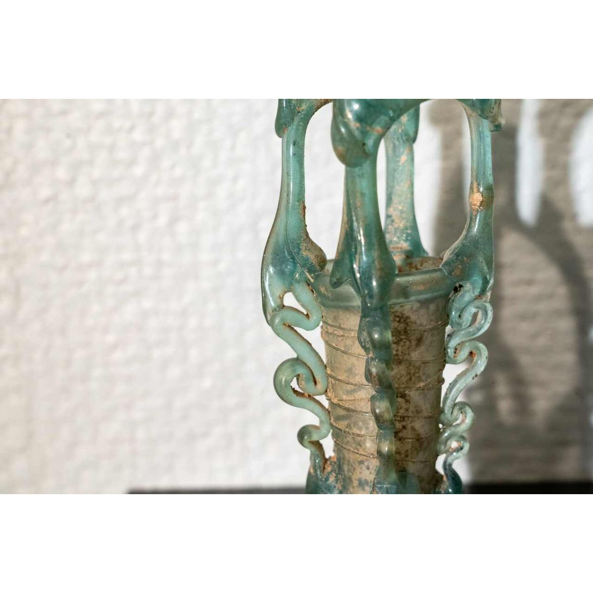 Verre romain en forme de panier - Hauteur : 20 cm. Époque : Bas-Empire romain, IVe-Ve siècle apr. J.-C. Diamètre du pied : 5,8 cm. Ce remarquable verre romain, de belle taille et d'une rare élégance, se distingue par sa forme en panier, soigneusement soufflée et façonnée selon les techniques verrières les plus raffinées de l'Antiquité tardive. Il présente une anse rubanée à deux étages, typique de certaines productions luxueuses du Bas-Empire. Le corps du récipient est finement fileté autour de la panse, créant un décor en relief à la fois subtil et rythmé, qui témoigne du savoir-faire des verriers antiques. Quatre rubans décoratifs, disposés selon un axe cardinal Nord, Sud, Est et Ouest ornent la panse, conférant à l'objet une symétrie harmonieuse et une dimension presque architecturale. Cette structuration suggère peut-être une fonction rituelle ou symbolique, ou bien simplement un raffinement esthétique destiné à plaire à une élite cultivée. Epoque: Bas-Empire romain, IVe-Ve siècle après J-C. Hauteur: 20 cm. Diamètre: 5,8 cm. Conservation: Bien que le pied ait été recollé, une restauration courante pour des objets de cette époque, l'ensemble se trouve dans un état de conservation exceptionnel. Sa rareté et sa qualité en font une pièce précieuse tant pour l'histoire de l'art que pour l'histoire des techniques antiques. Provenance: Ancienne collection aristocratique anversoise du Docteur J. M., transmise au sein de la même famille depuis plus d'un demi-siècle, ce qui lui confère une provenance solide et prestigieuse. Une facture et un certificat d'authenticité seront fournis à l'acheteur.