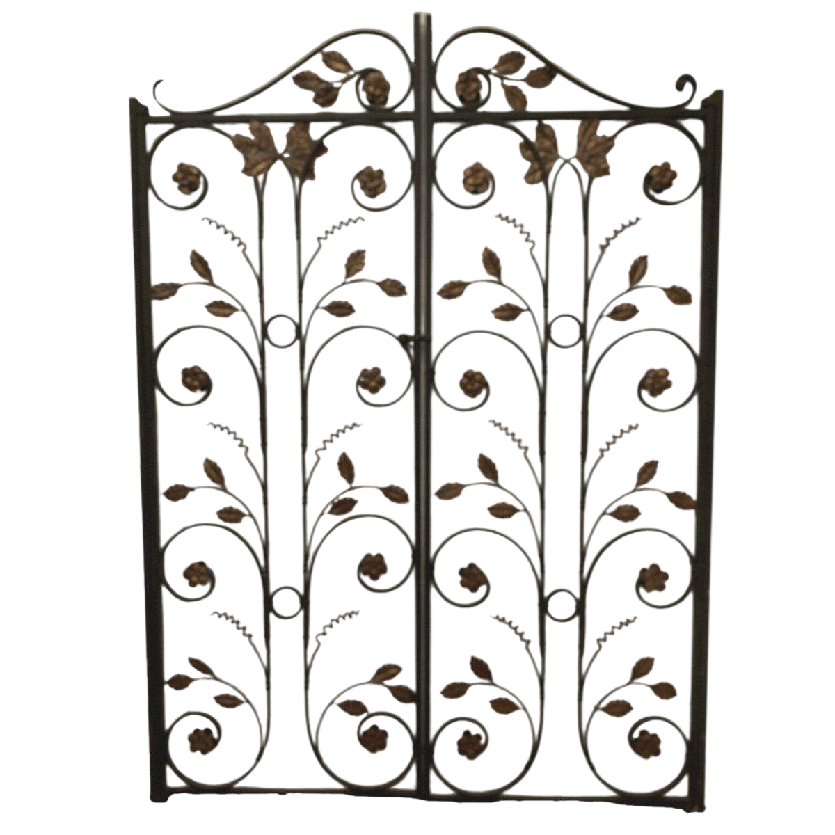Deux vantaux à décor de volutes et feuillages en tôle dorée.