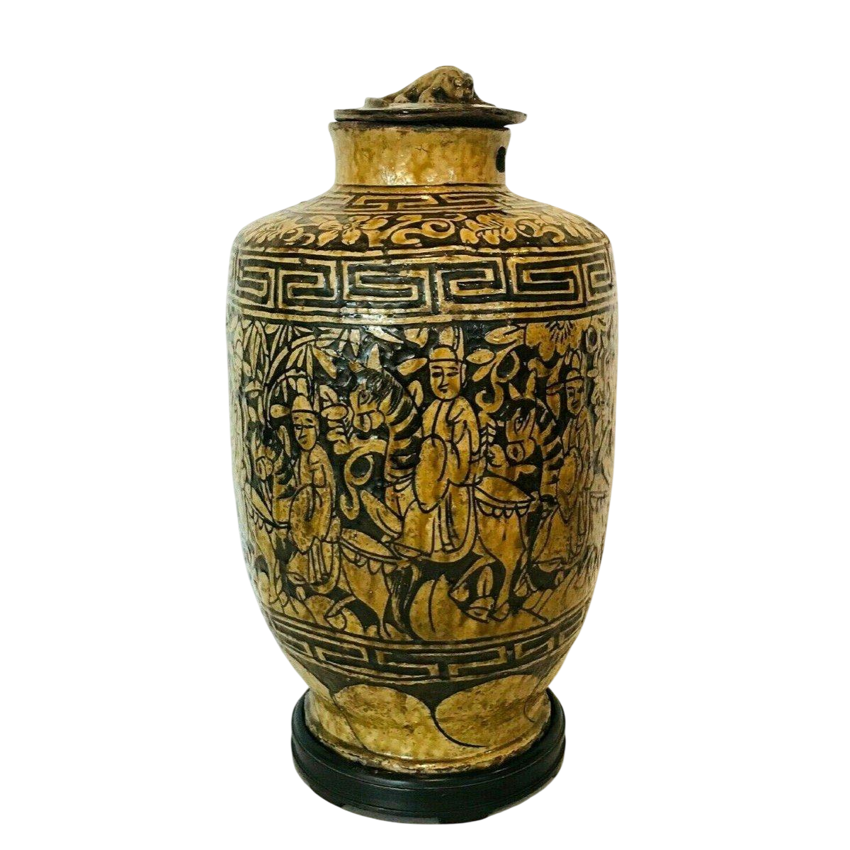 (https://www.artaplaza.com/fr/verres-cristal-sculptures/8402-vase-couvert-en-faience-craquelee-decor-chinoisant-de-personnages-cheval-et-sala.html)