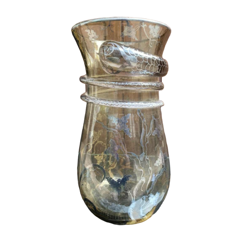 Vase en verre de murano (vénitien), application de serpent, décor peint argenté