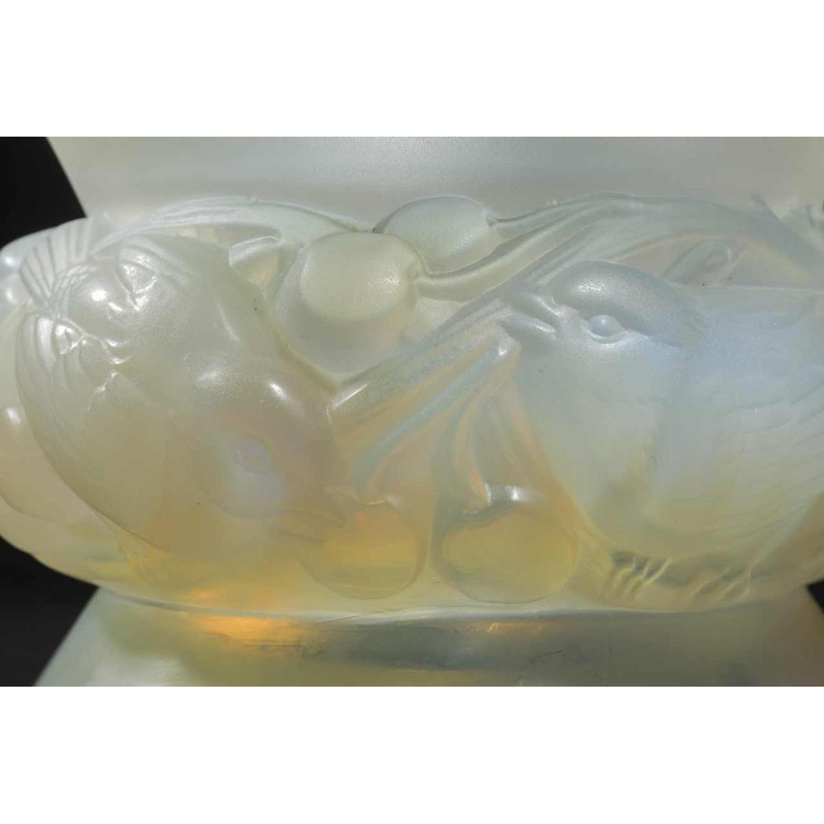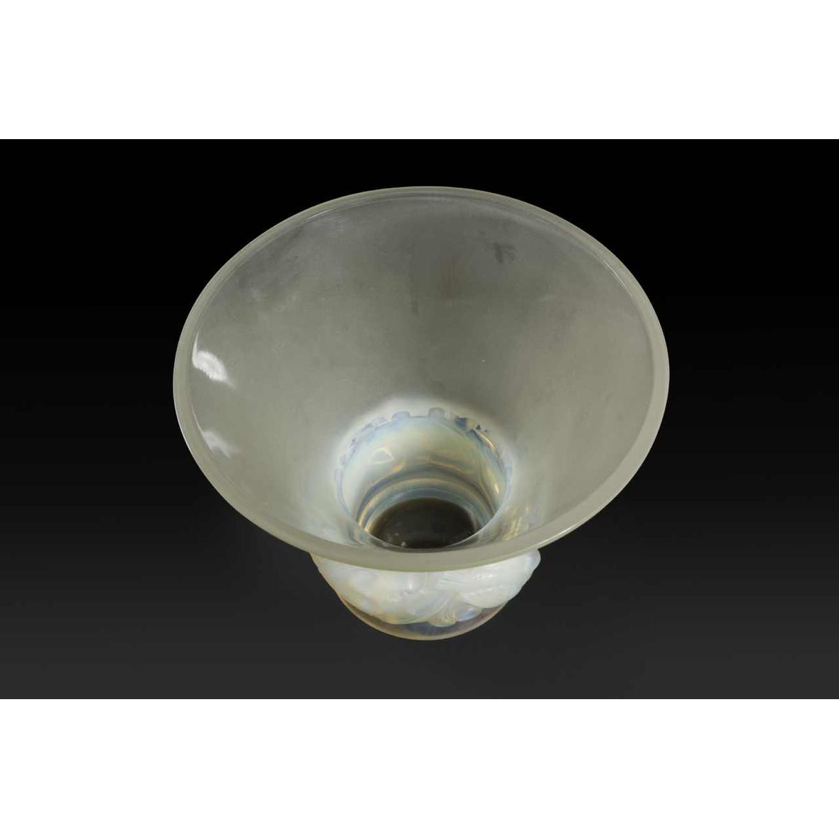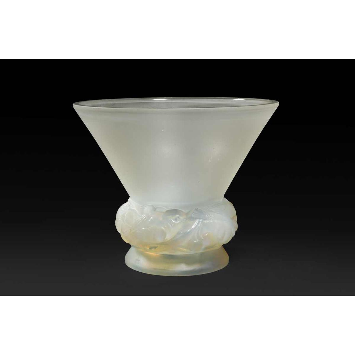 Vase « PINSONS » modèle créé par RENNE LALQIUE (1860-1945) le 9 Septembre 1930, verre blanc moulé-pressé patiné opalescent. Signature : « R. Lalique, France » gravé au cul du vase. Dimensions : - Hauteur : 20 cm ; - Diamètre : 18 cm ; Références : « R. LALIQUE, CATALOGUE RAISONNE DE L'ŒUVRE DE VERRE », FELIX MARCILHAC, Les Editions de L'Amateur, 2011, page 446, N° 1038.