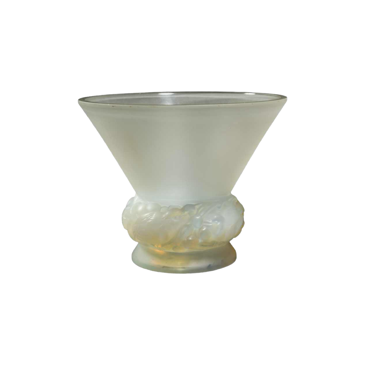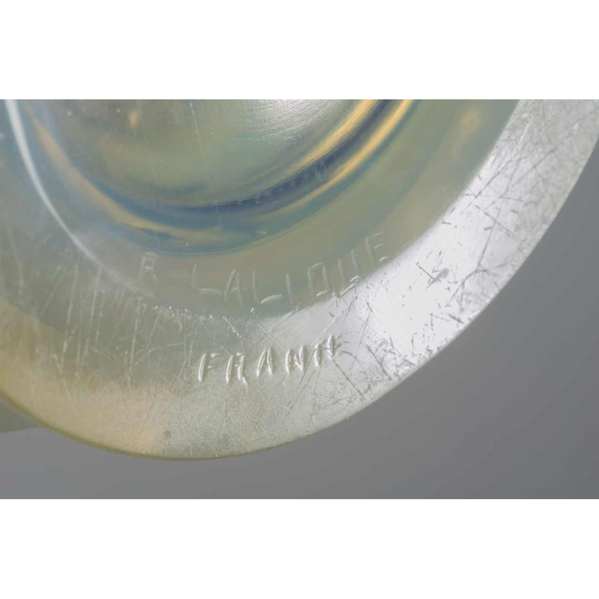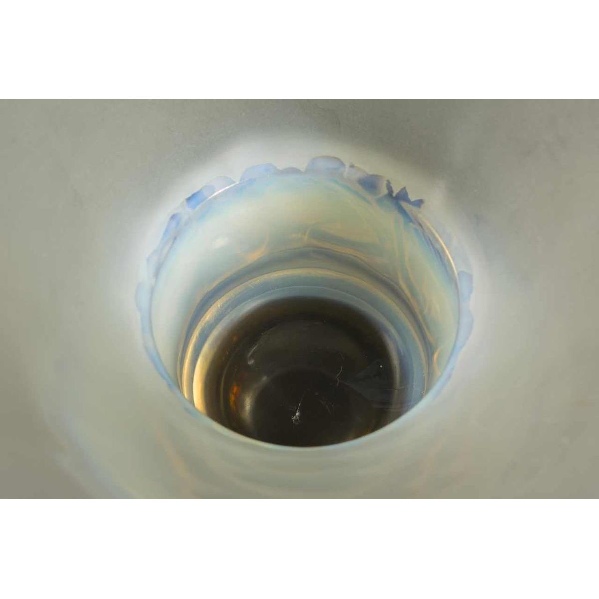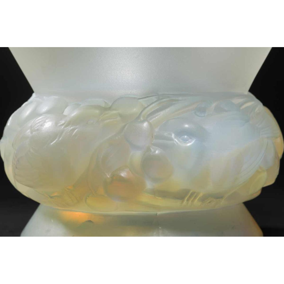 Vase « PINSONS » modèle créé par RENNE LALQIUE (1860-1945) le 9 Septembre 1930, verre blanc moulé-pressé patiné opalescent. Signature : « R. Lalique, France » gravé au cul du vase. Dimensions : - Hauteur : 20 cm ; - Diamètre : 18 cm ; Références : « R. LALIQUE, CATALOGUE RAISONNE DE L'ŒUVRE DE VERRE », FELIX MARCILHAC, Les Editions de L'Amateur, 2011, page 446, N° 1038.