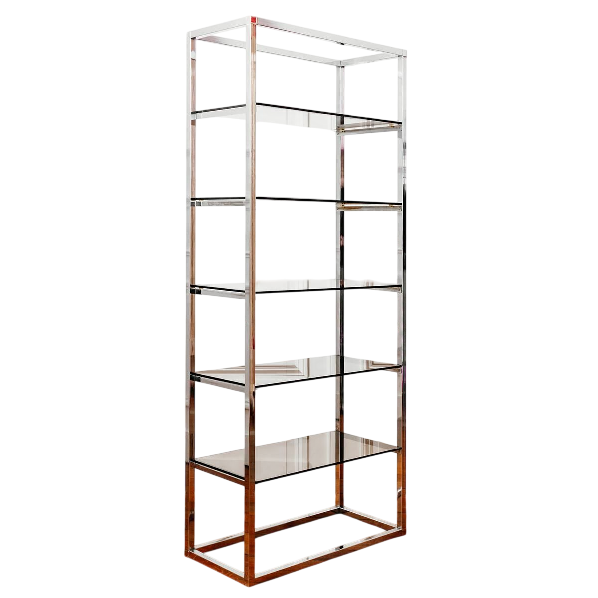 Étagère des années 1970 en structure chromée, composée de plateaux en verre fumé.