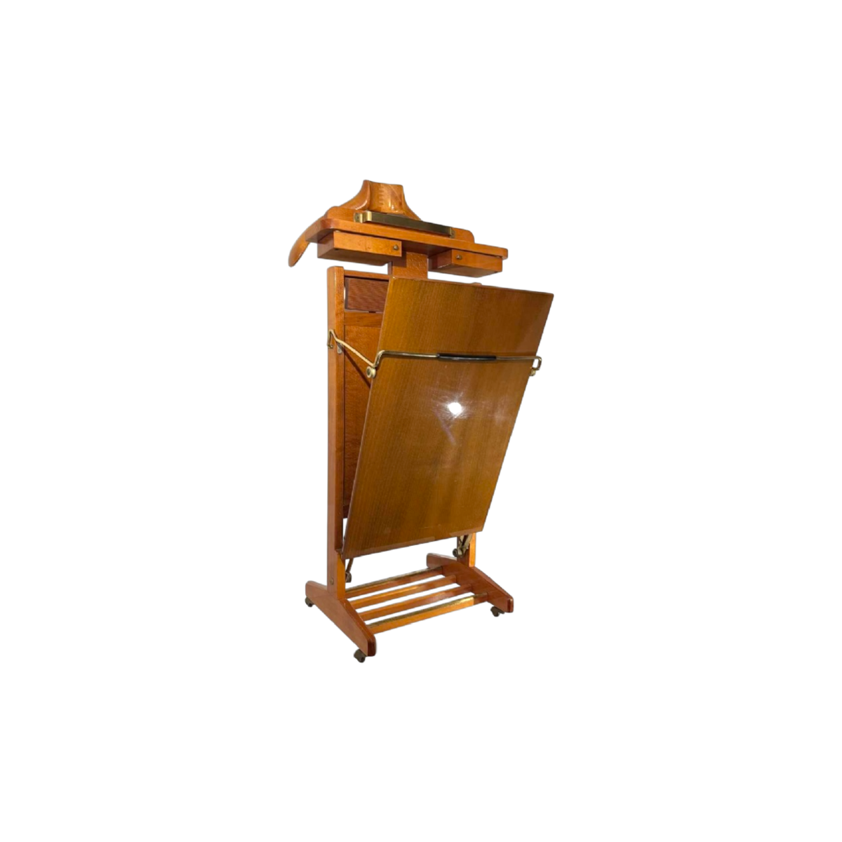 Structuur in gelakt notenhout, messing elementen: kleerhanger, broeksteun, opbergbak en wielen.