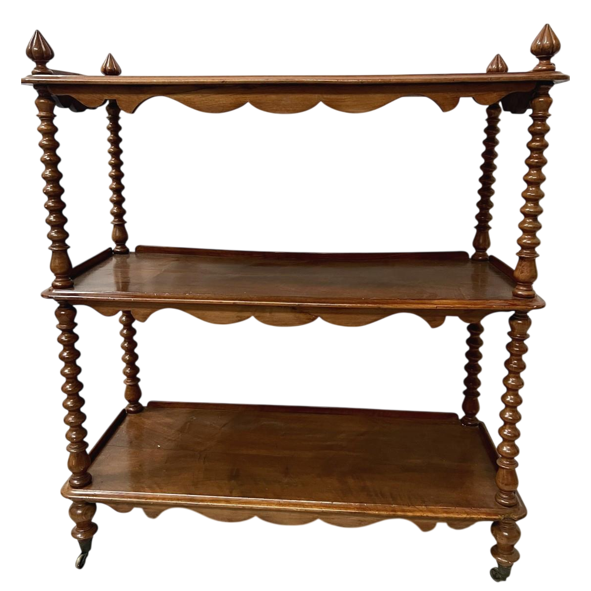 Vier staanders met gedraaide kolommen op vier zwenkpoten met wielen. Drie presentatieplateaus met gevormde voorkanten.