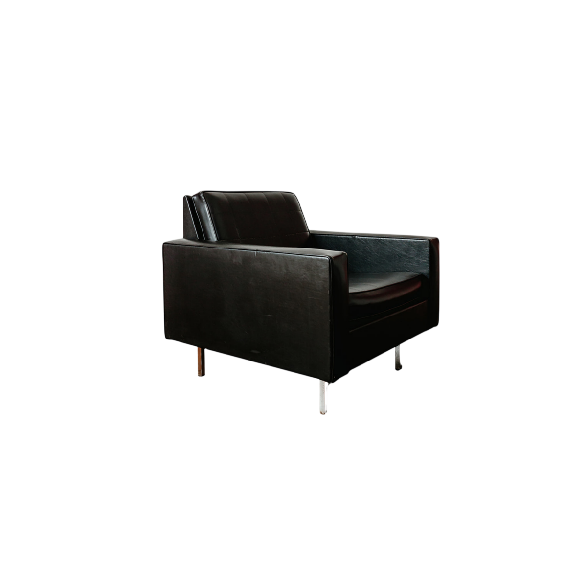 Deze fauteuil verkeert in goede vintage staat en vertoont gebruikssporen en patina die passen bij de leeftijd en het gebruik, zoals lichte imperfecties in de kunstlederen bekleding en putjes in het metalen onderstel.