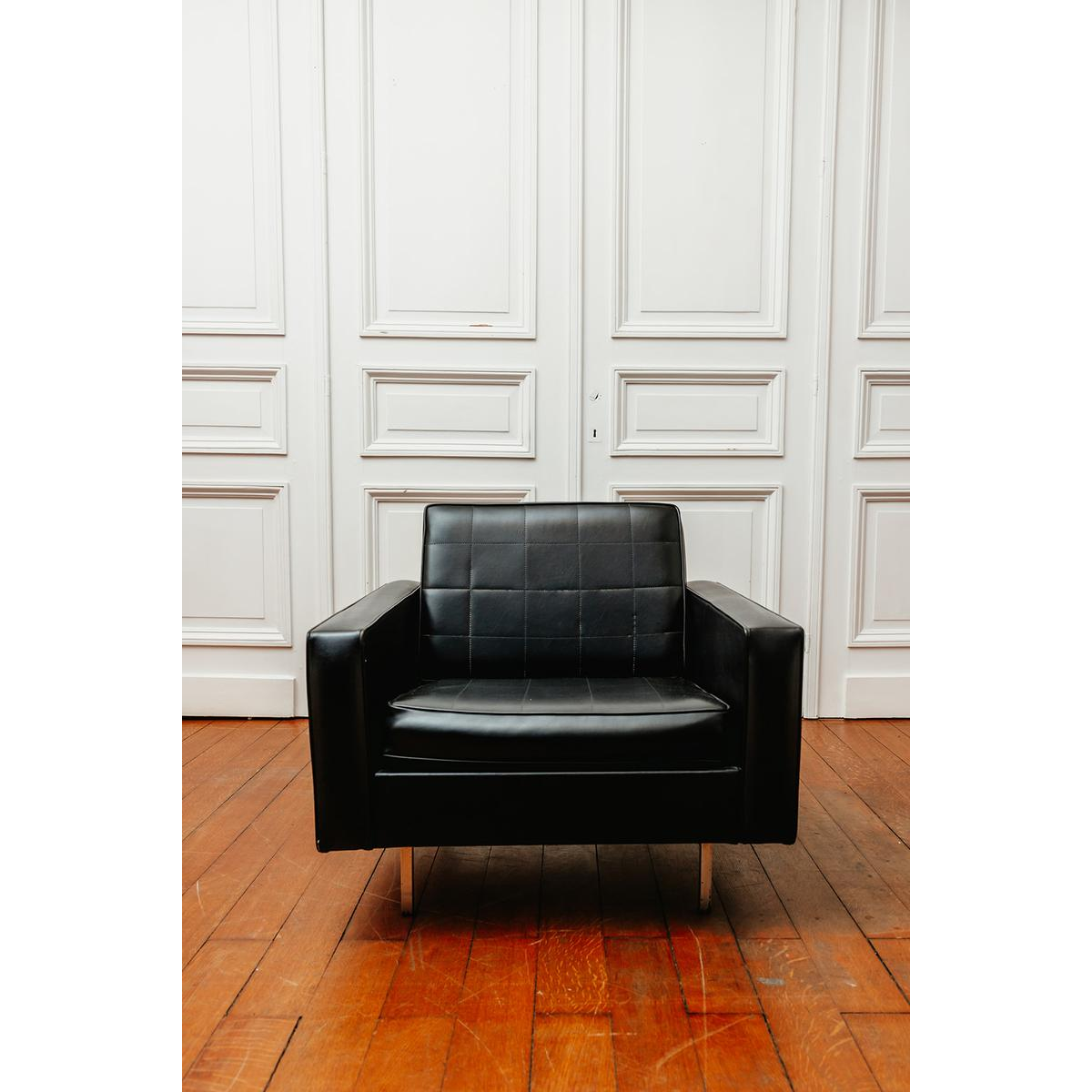 Fauteuil in zwart kunstleer op buisvormige poten met gewatteerde kussens.