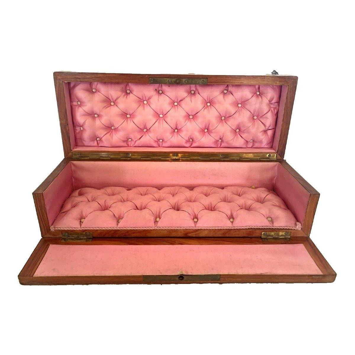 Centraal medaillon van gegraveerd messing in marqueterie, ingelegd met parelmoer. Binnenkant bekleed met roze zijde (zeer schoon).