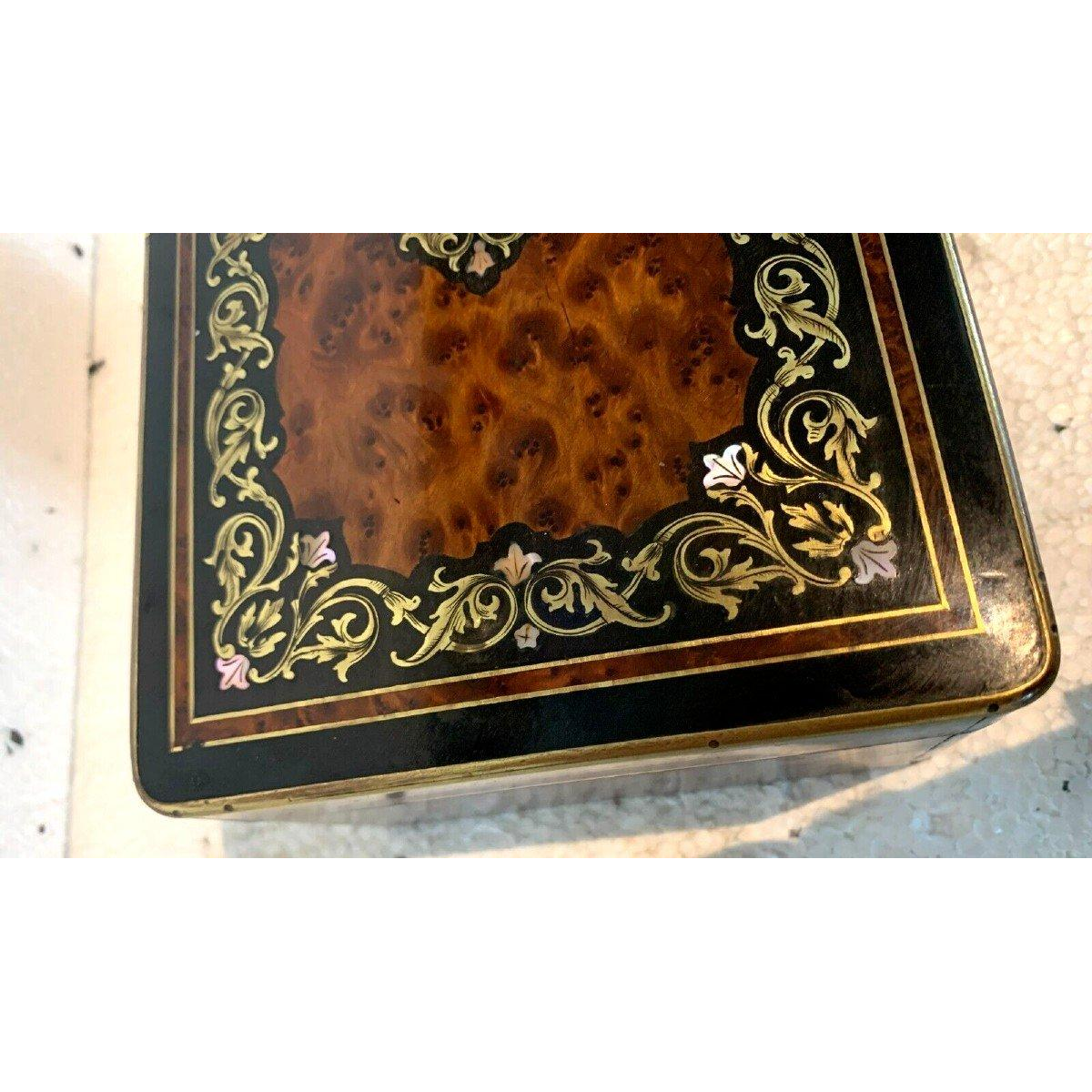 Het is gemaakt van thuya-wortelhoutfineer en versierd met elegant inlegwerk van gegraveerd messing op een zwarte houten achtergrond.