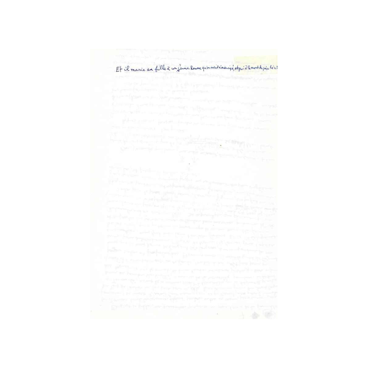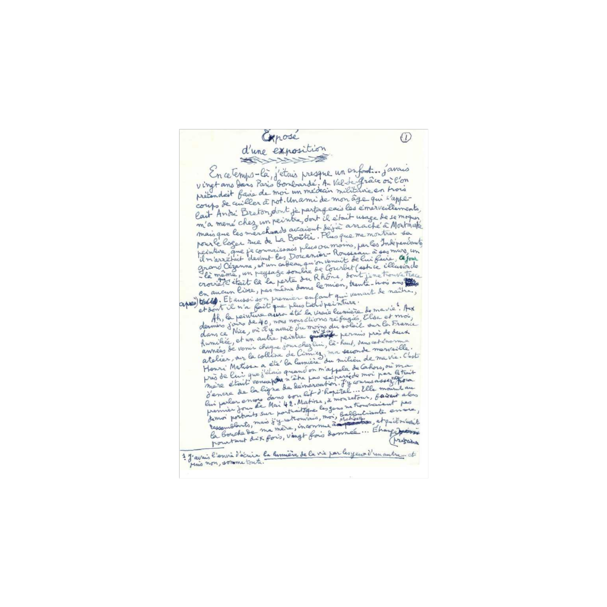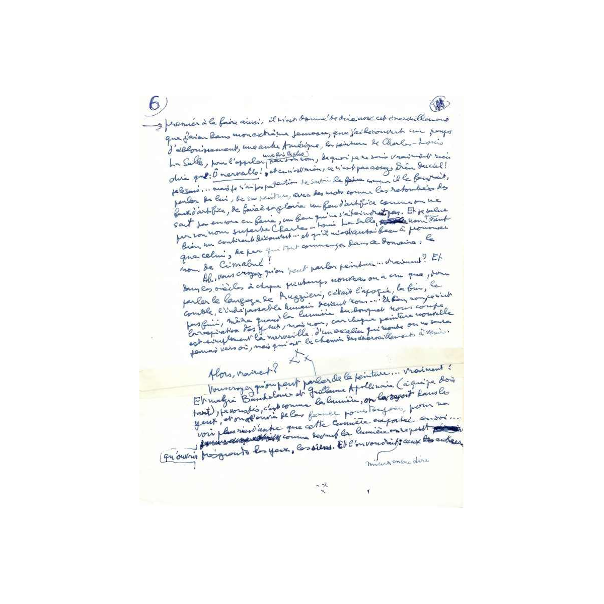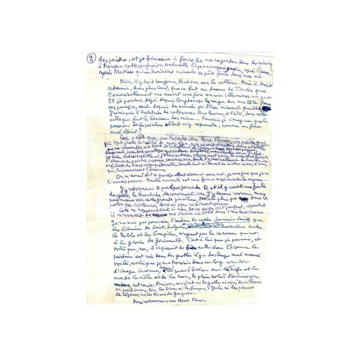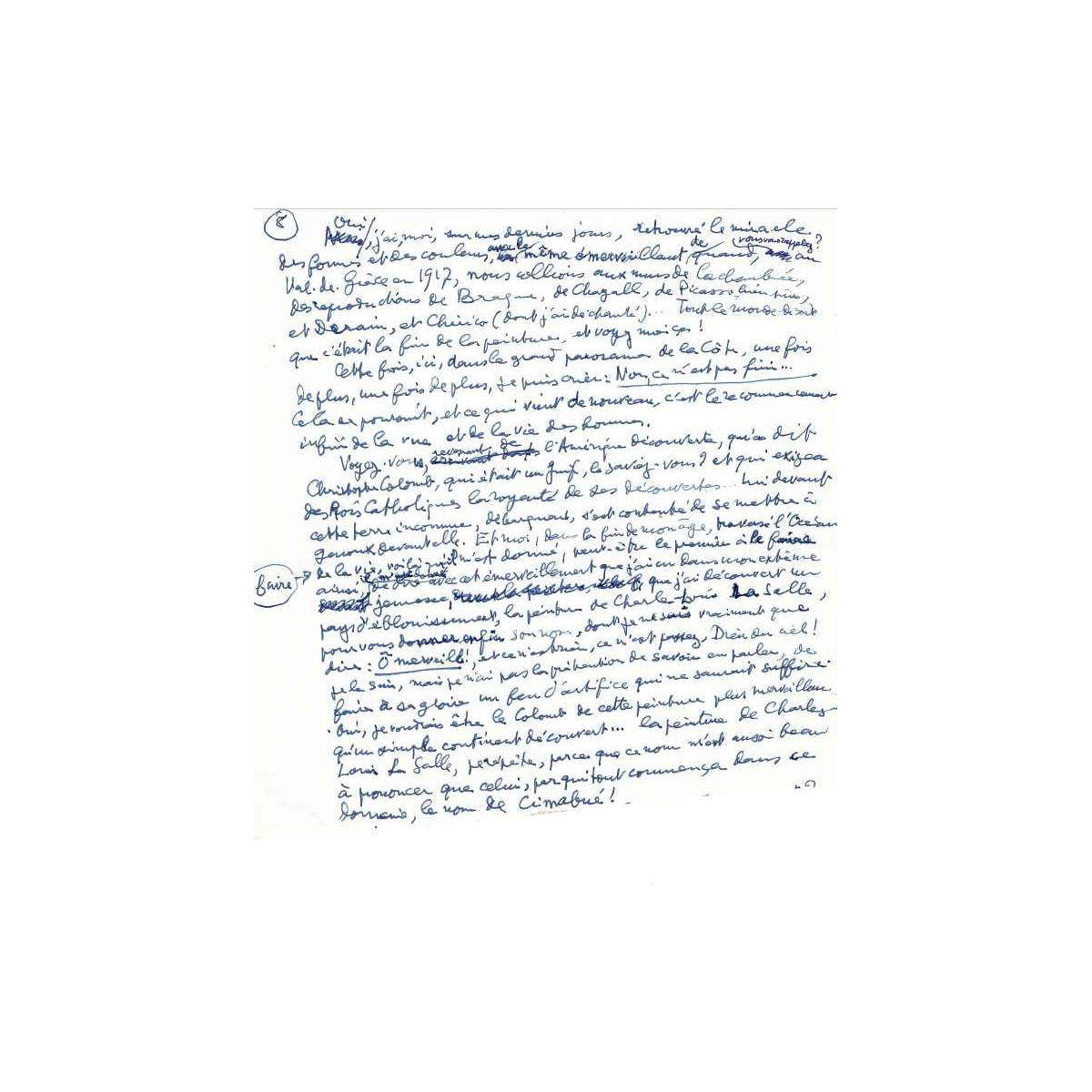 Uniek manuscript van Louis Aragon als eerbetoon aan de kunstenaar Charles-Louis Lasalle, 1977. Twaalf pagina's handgeschreven tekst en gedicht, geschreven in blauwe inkt op wit papier. De tekst illustreert de werkwijze van Louis Aragon, toen 80 jaar oud, en bevat talrijke toevoegingen, aantekeningen en wijzigingen. Door de auteur "exposé d'une exposition" genoemd, presenteert Louis Aragon de tekst op poëtische wijze en begeleidt deze met talrijke citaten van kunstenaars, waarbij hij de nadruk legt op het medium schilderkunst waarmee hij zijn ontdekking associeerde, die hij beschouwde als een van de grootste in de schilderkunst, Charles-Louis Lasalle.