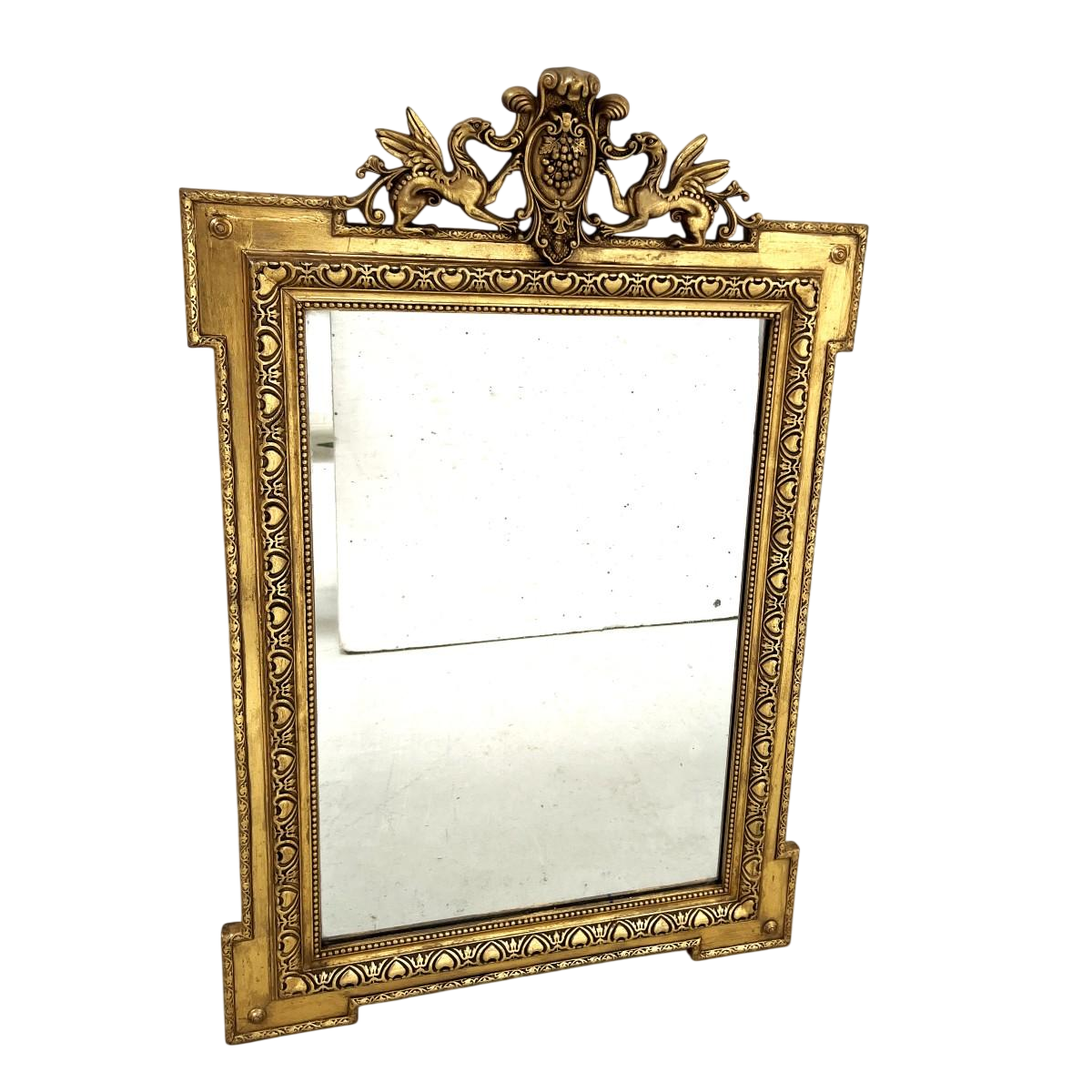 Spiegel in Lodewijk XVI-stijl van hout en verguld stucwerk, met gegroefde lijst en een fronton versierd met een wapenschild en twee draken.