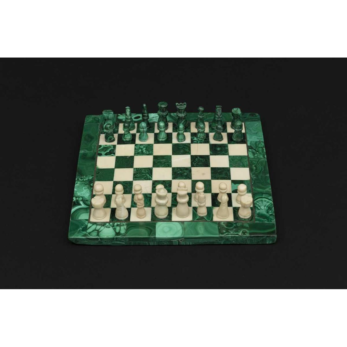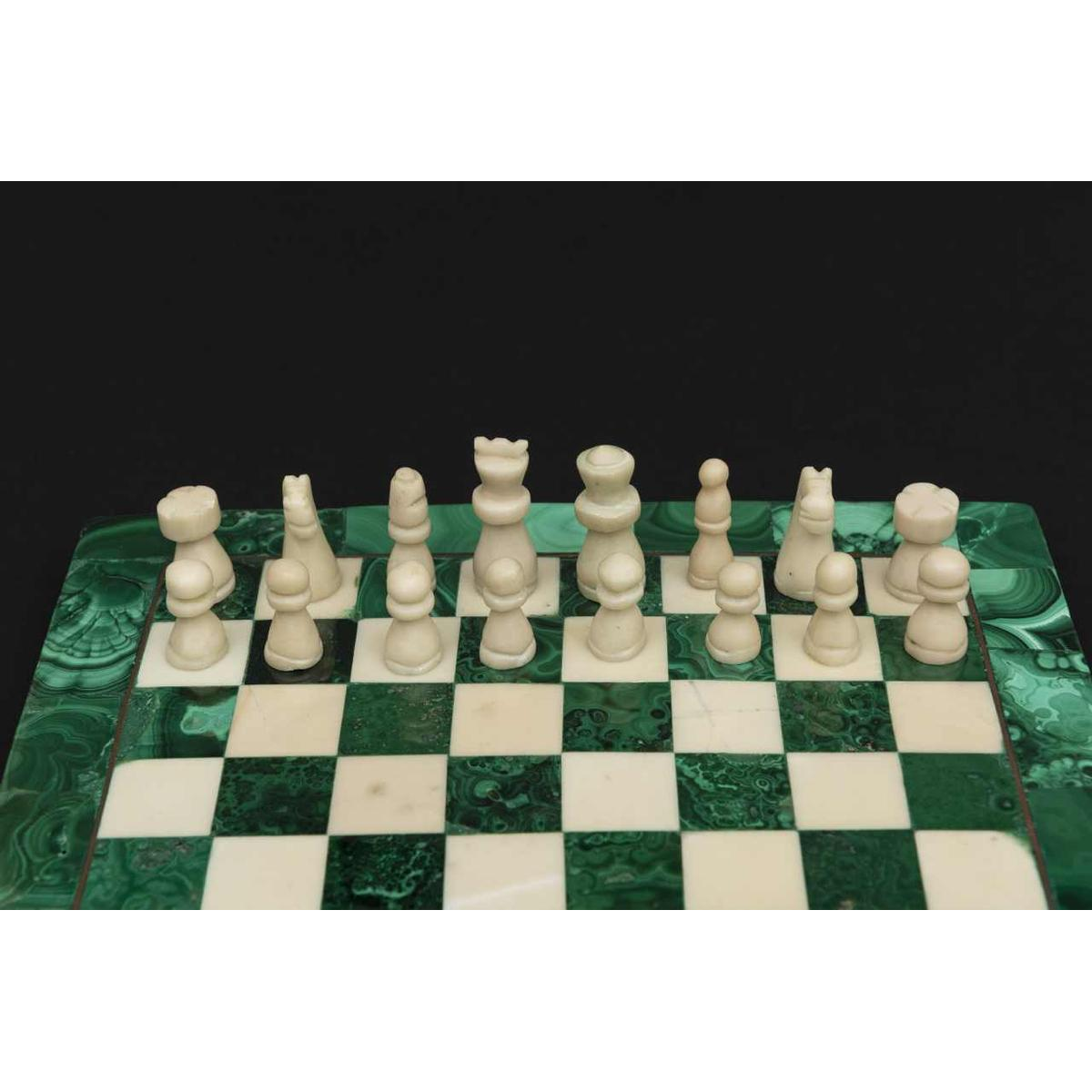 Het schaakbord heeft een vierkante vorm met een dunne malachieten rand ingelegd met messing accenten rondom het bord en de schaakstukken, die gemaakt zijn van malachiet en Carrara marmer.