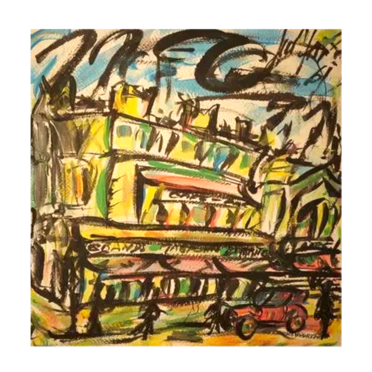 Generaal Paul (1895-1975). Gouache, 1961. Gesigneerd en gedateerd rechtsboven. Deze gouache uit 1961 illustreert perfect de oogverblindende energie en expressionistische stijl die kenmerkend zijn voor het werk van Generaal Paul, een belangrijke figuur in Montmartre. De dichte en levendige compositie is opgebouwd rond snelle, nerveuze, bijna kalligrafische zwarte penseelstreken die een stedelijk landschap of een levendige scène structureren, typisch voor de kunstenaar. De levendige kleuren – geel, blauw, groen en rood – zijn in dynamische penseelstreken aangebracht, waardoor een indruk van continue beweging ontstaat.
