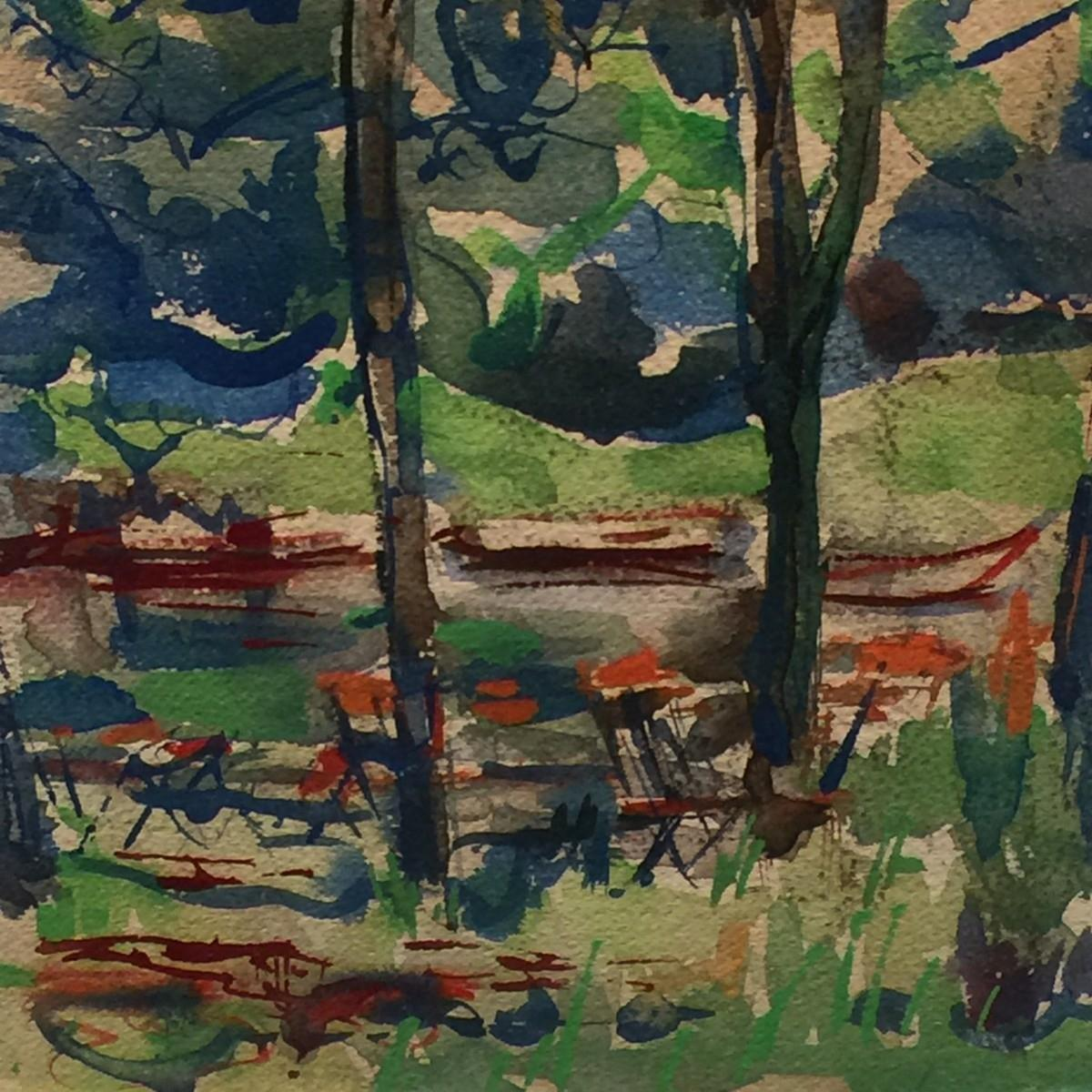 Gouache sur papier de Flory Roland (Liège 1905-1978) représentant une terrasse en un sous-bois lumineux. Subtile mélange d'impressionnisme et de fauvisme, un peu à la manière de Rik Wouters. Très bel état de conservation, nouvel encadrement et passe-partout.