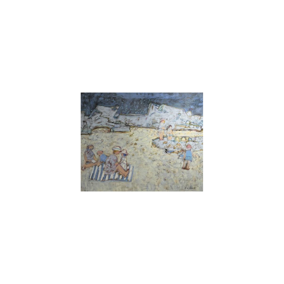 Een prachtig strandtafereel van Yves Wacheux (1933-2023), een schilder uit de 20e eeuw, toont een groep figuren op het zand, uitkijkend op de zee, in een zachte, licht nevelige atmosfeer. De kunstenaar legt een eenvoudig, rustig moment uit het leven vast, waarin volwassenen en kinderen de ruimte tussen de zee en de duinen delen.