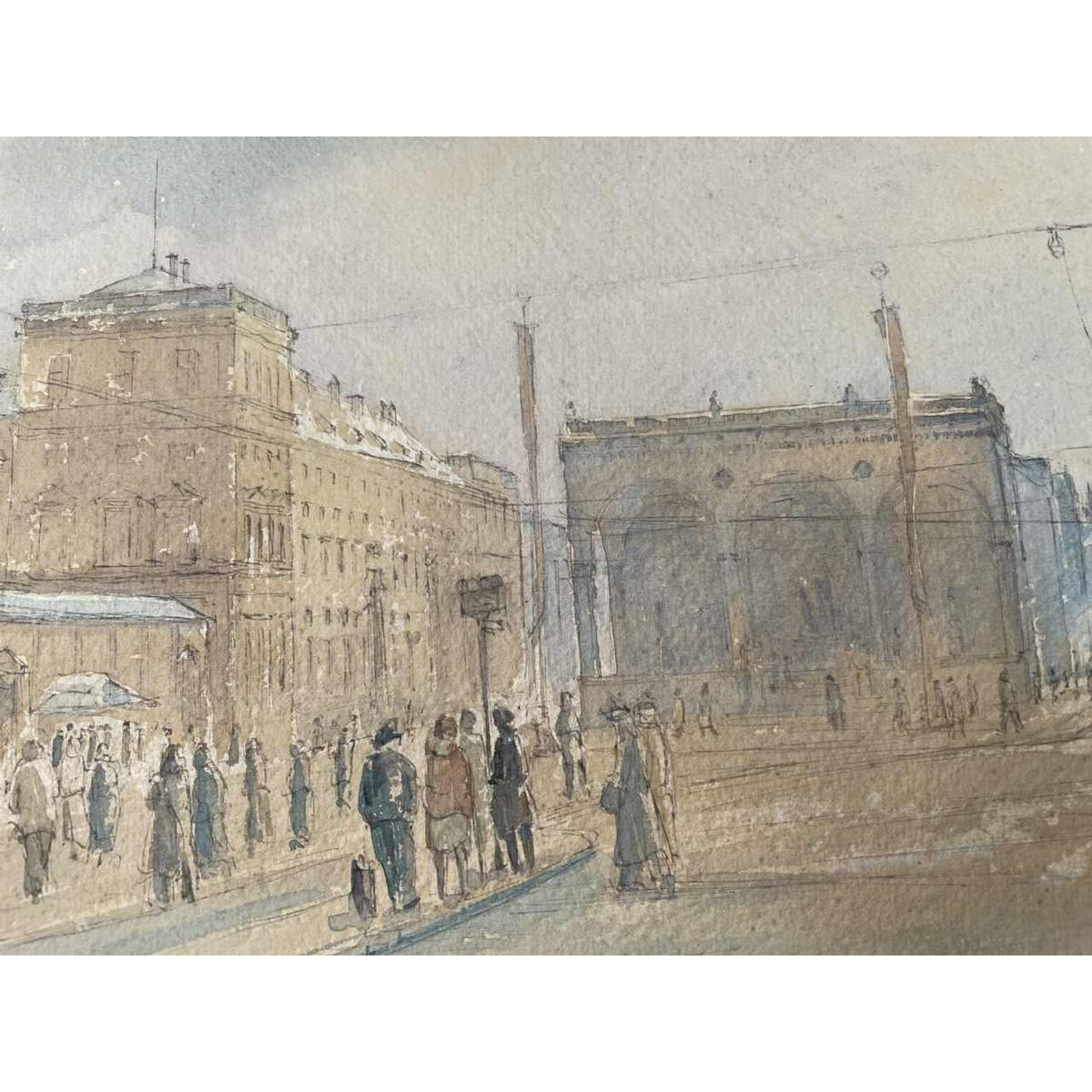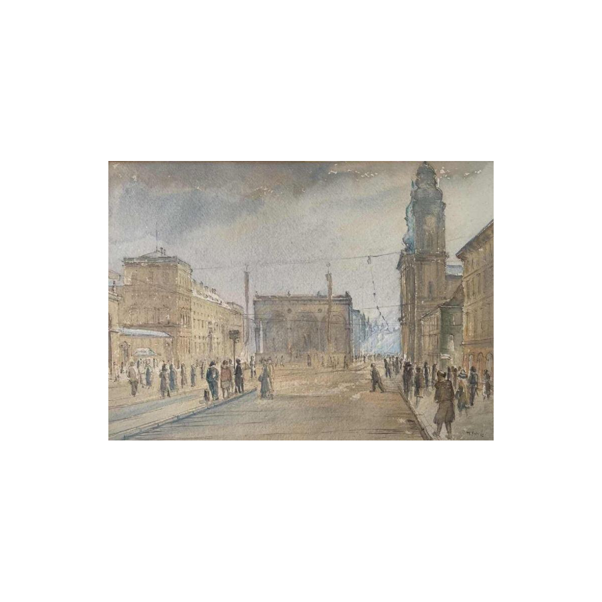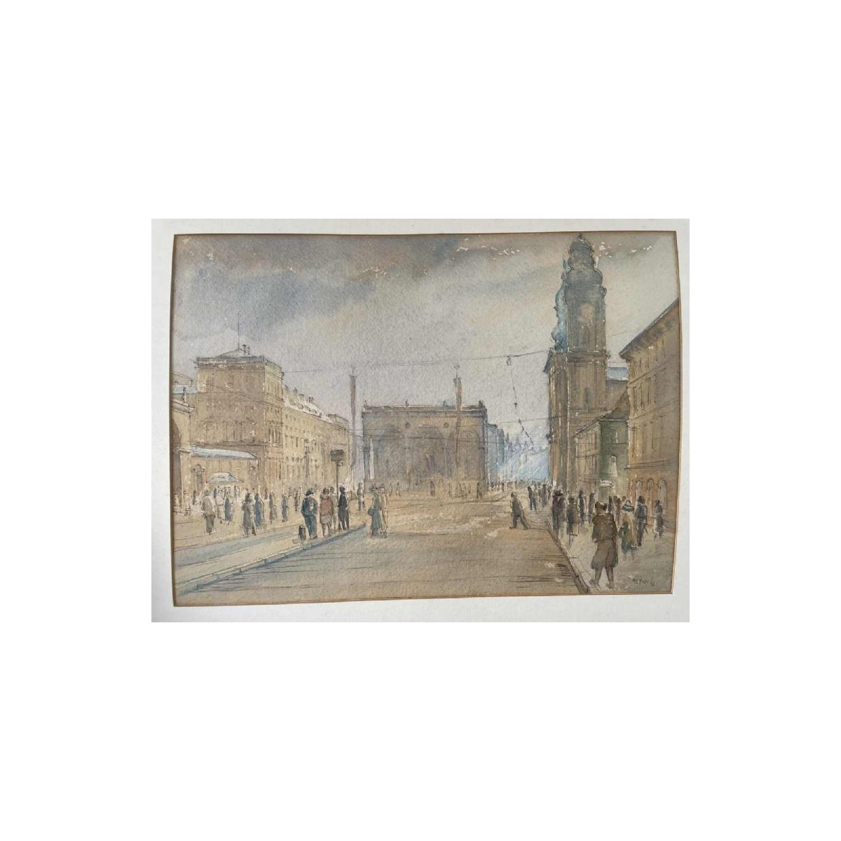 Prachtige aquarel van een uitzicht op een drukke straat in München in 1942
