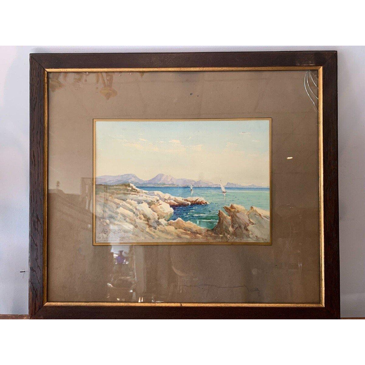 Ingelijst gouache schilderij "Twee boten op een bergmeer" – 20e eeuw