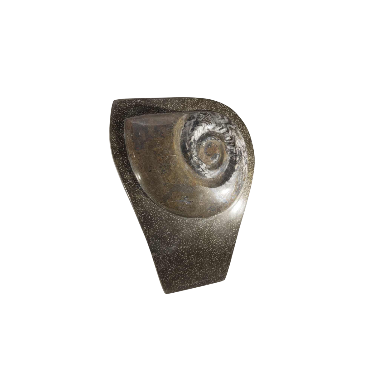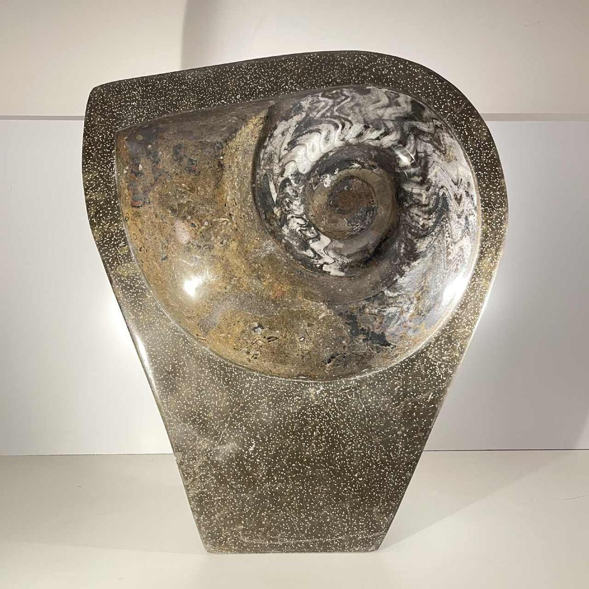 Groot fossiel van een ammoniet, uit één stuk steen gehouwen, 53 cm hoog.