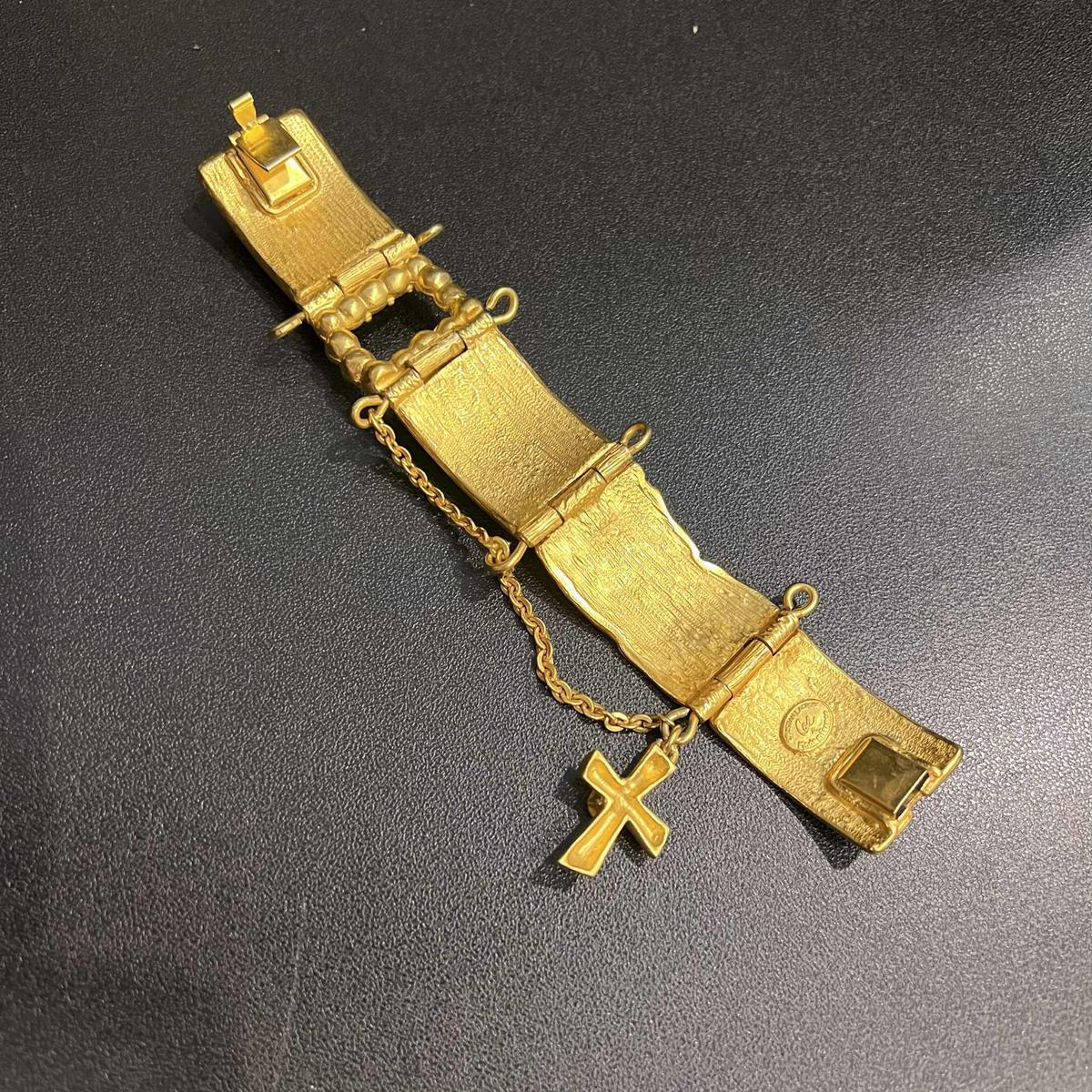 Christian LACROIX, beweegbare manchetarmband in goudkleurig metaal, met strass-steentjes en brokaatmotieven.