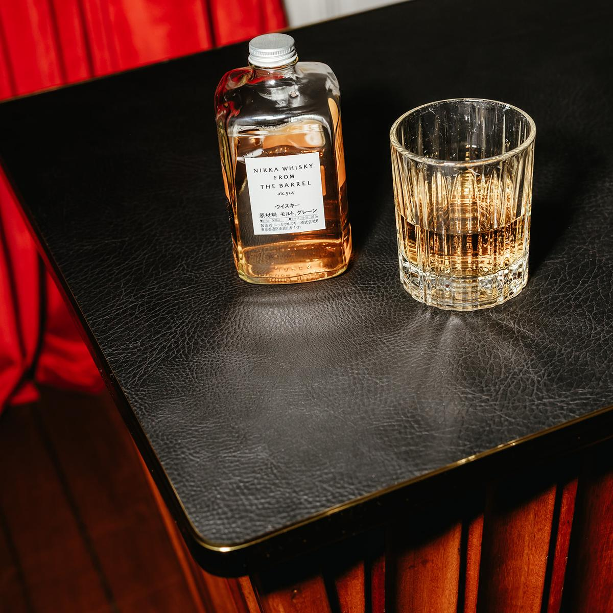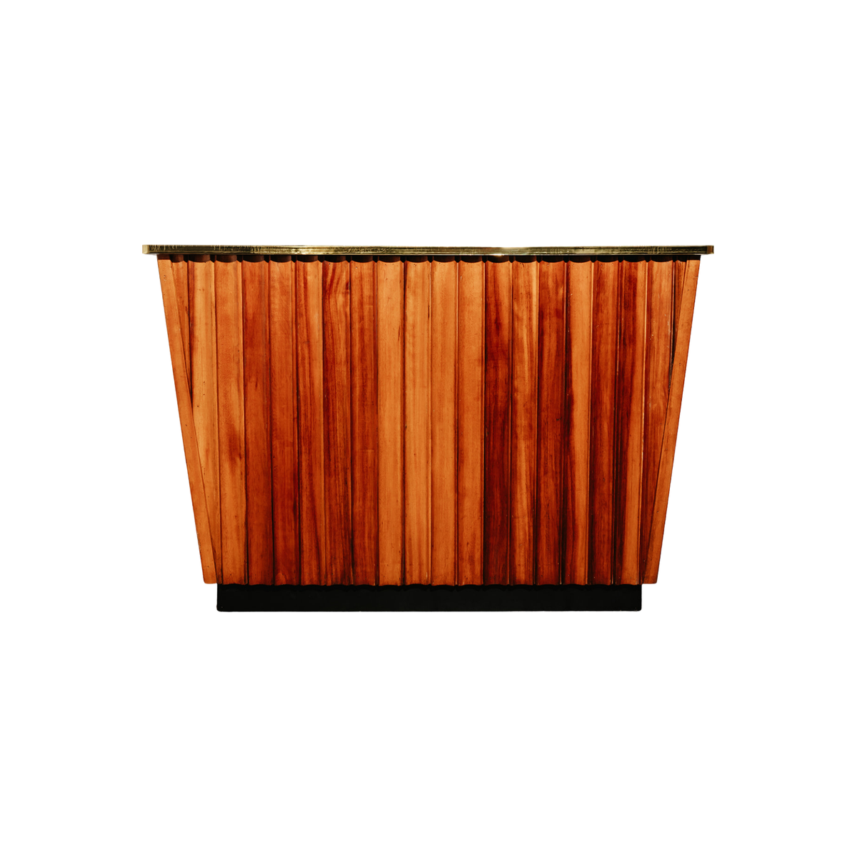 Een houten bar uit de jaren 60 met een licht uitlopend silhouet en een grafisch verticaal ritme.