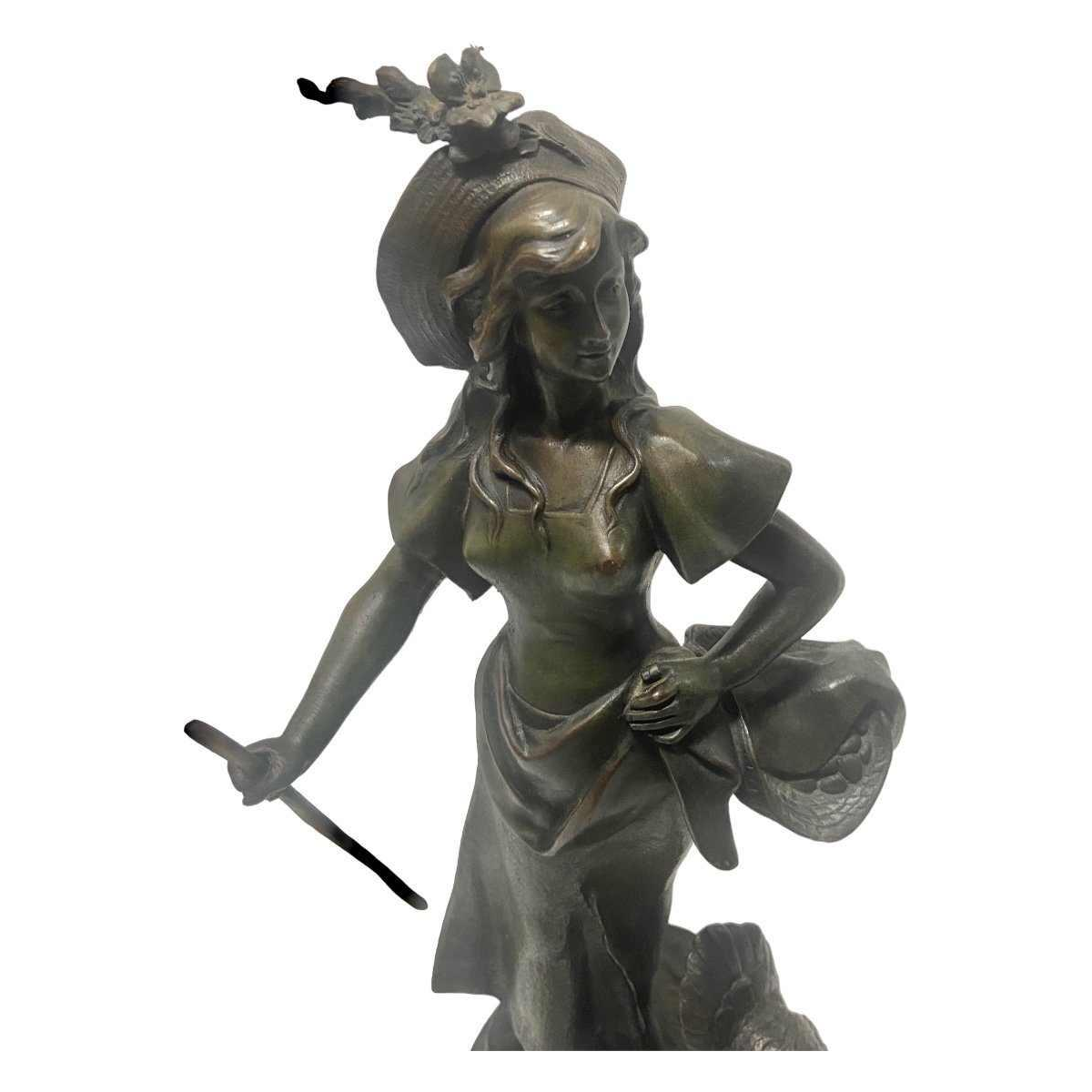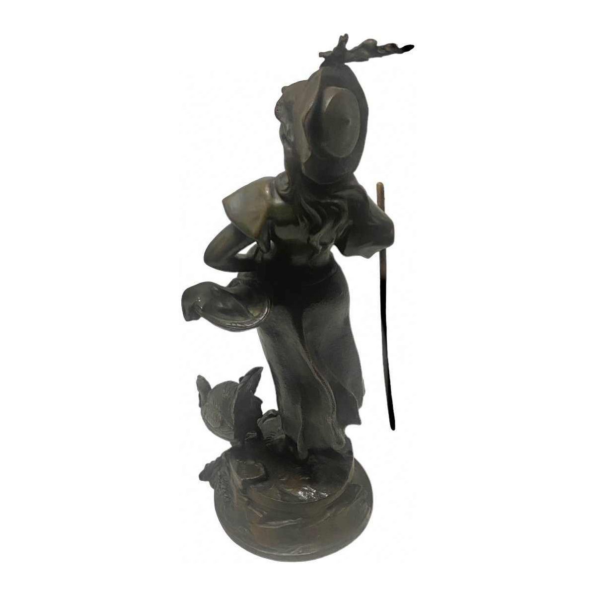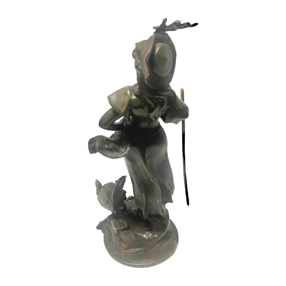 Zeldzaam bronsje van een jonge dame met een kip aan haar zijde.