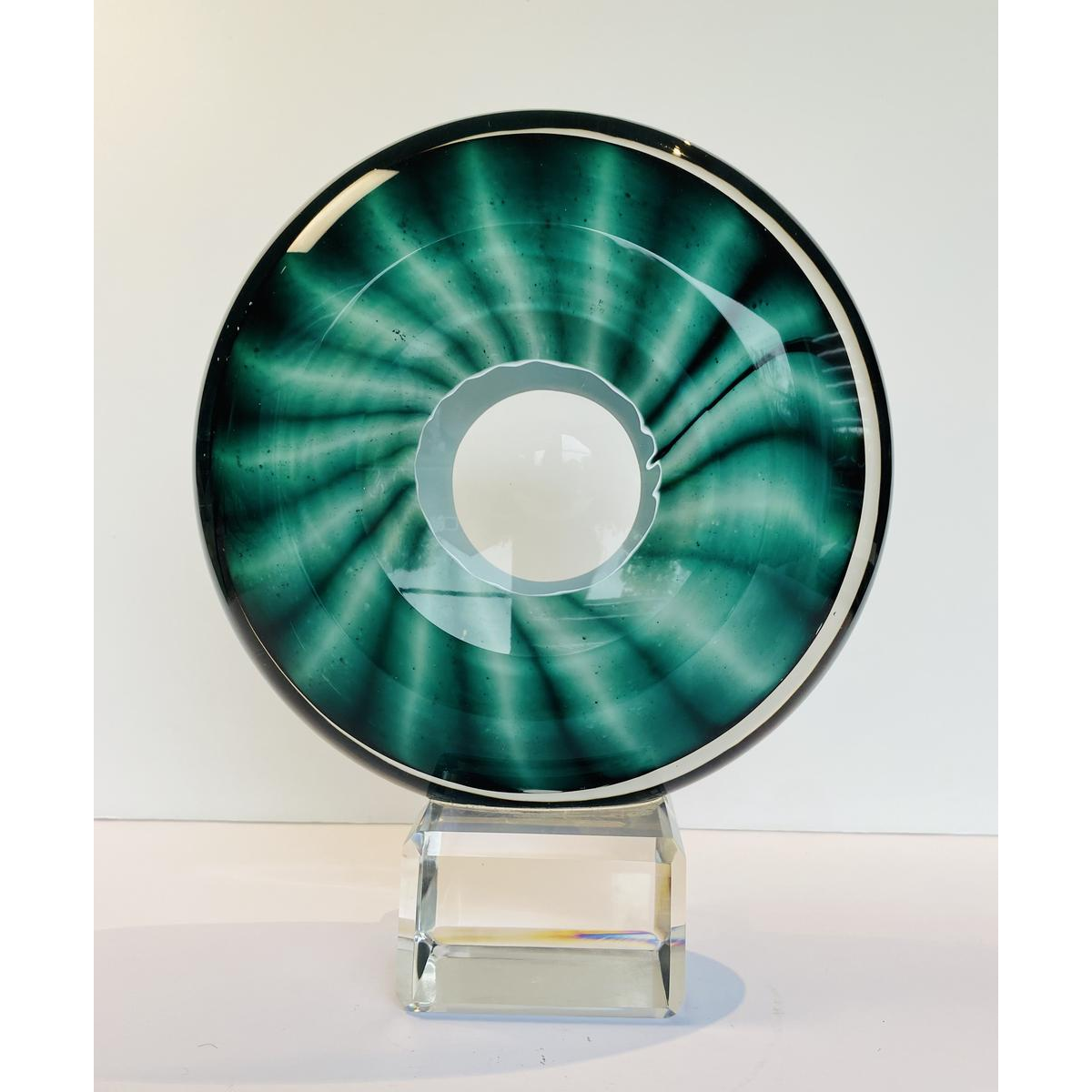 This form is only used to notify us of illegal content on product: Alfred Collard, sculptuur "Disc" in helder kristal, drievoudig uitgevoerd in wit en groen.