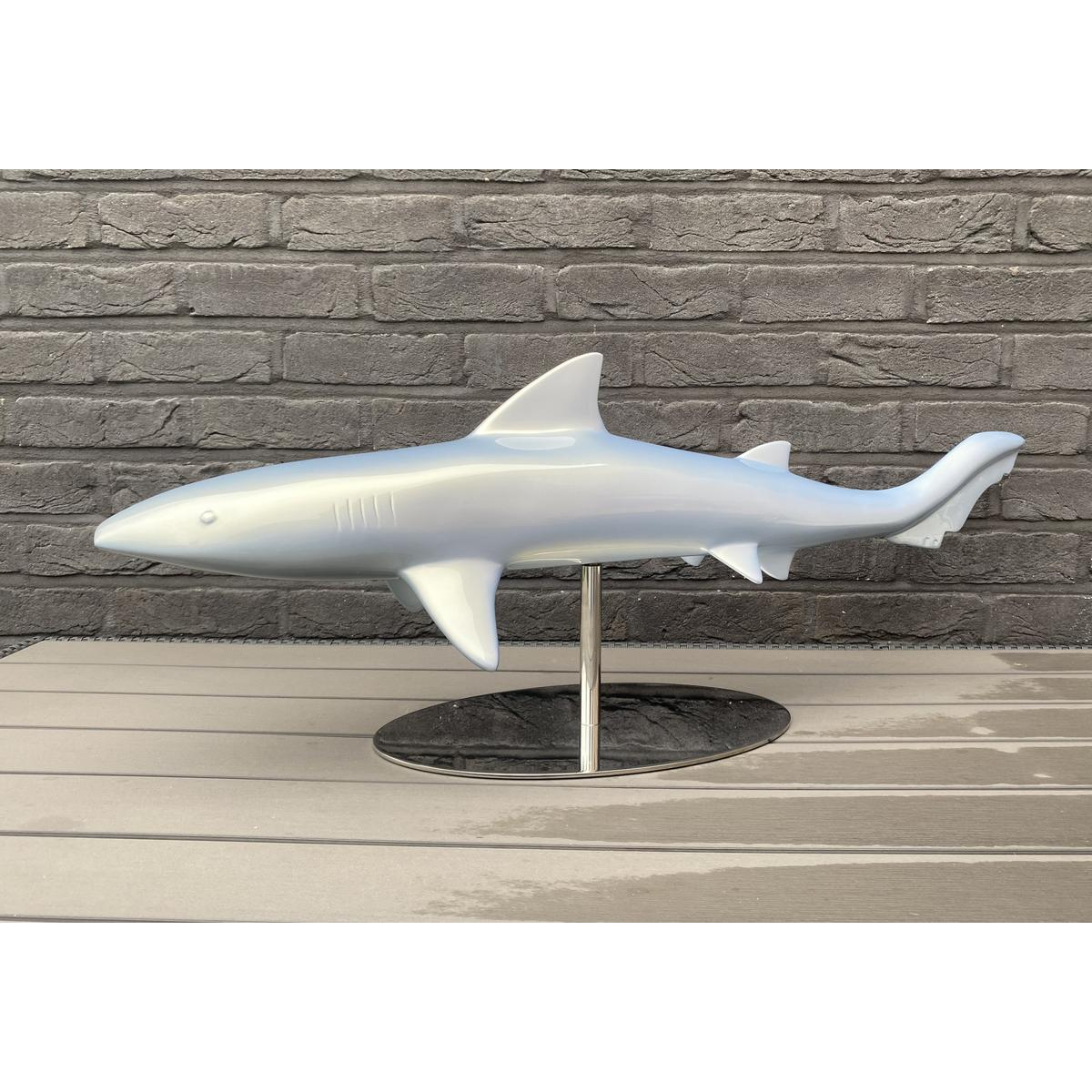 Hedendaagse, gestileerde sculptuur van een haai, in blauwgrijs gelakt brons. Het staat op een roestvrijstalen voetstuk. Het is gesigneerd door de Hongaarse kunstenaar Laszlo TIBAY en draagt het stempel van de gieterij Caster Bronz Kft. Derde exemplaar geleverd met het certificaat van de kunstenaar.