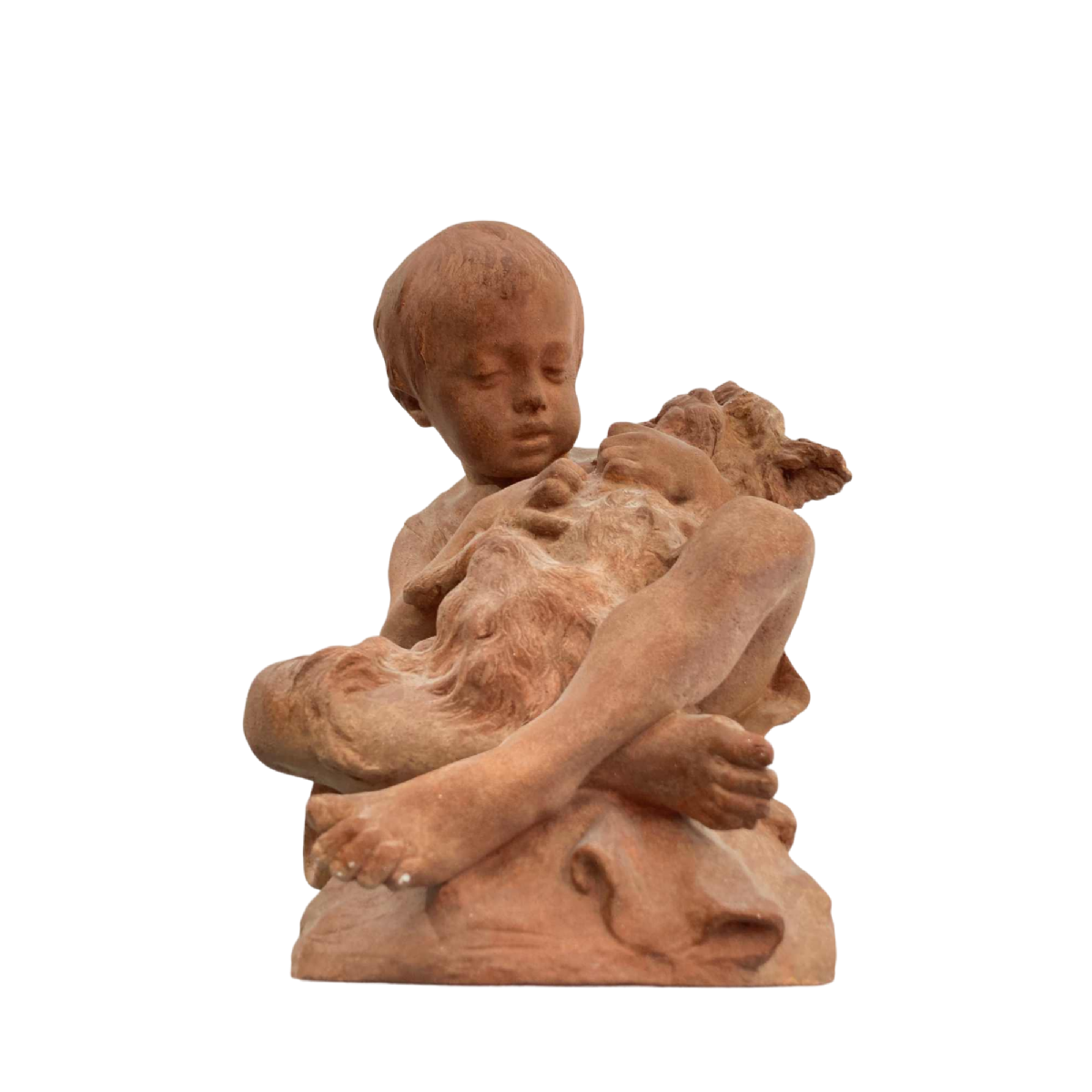 Namen Émilie Jean Fe. Beeldhouwwerk van terracotta 'Kind met hond' 1877