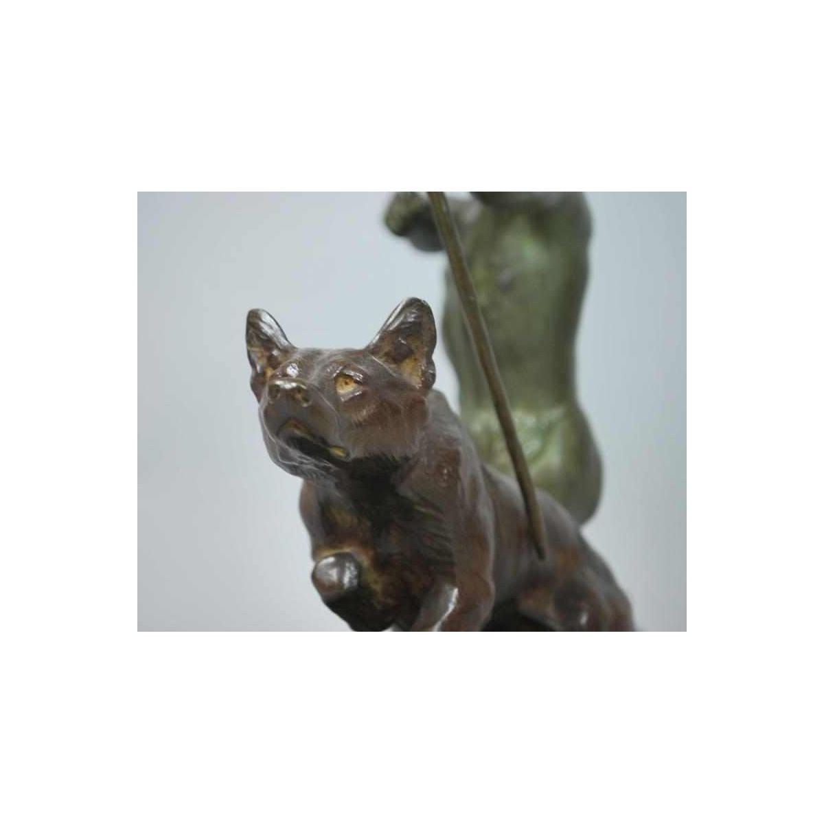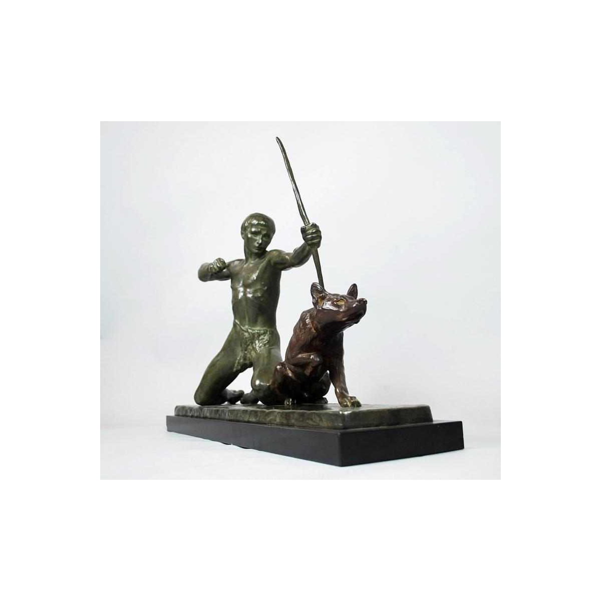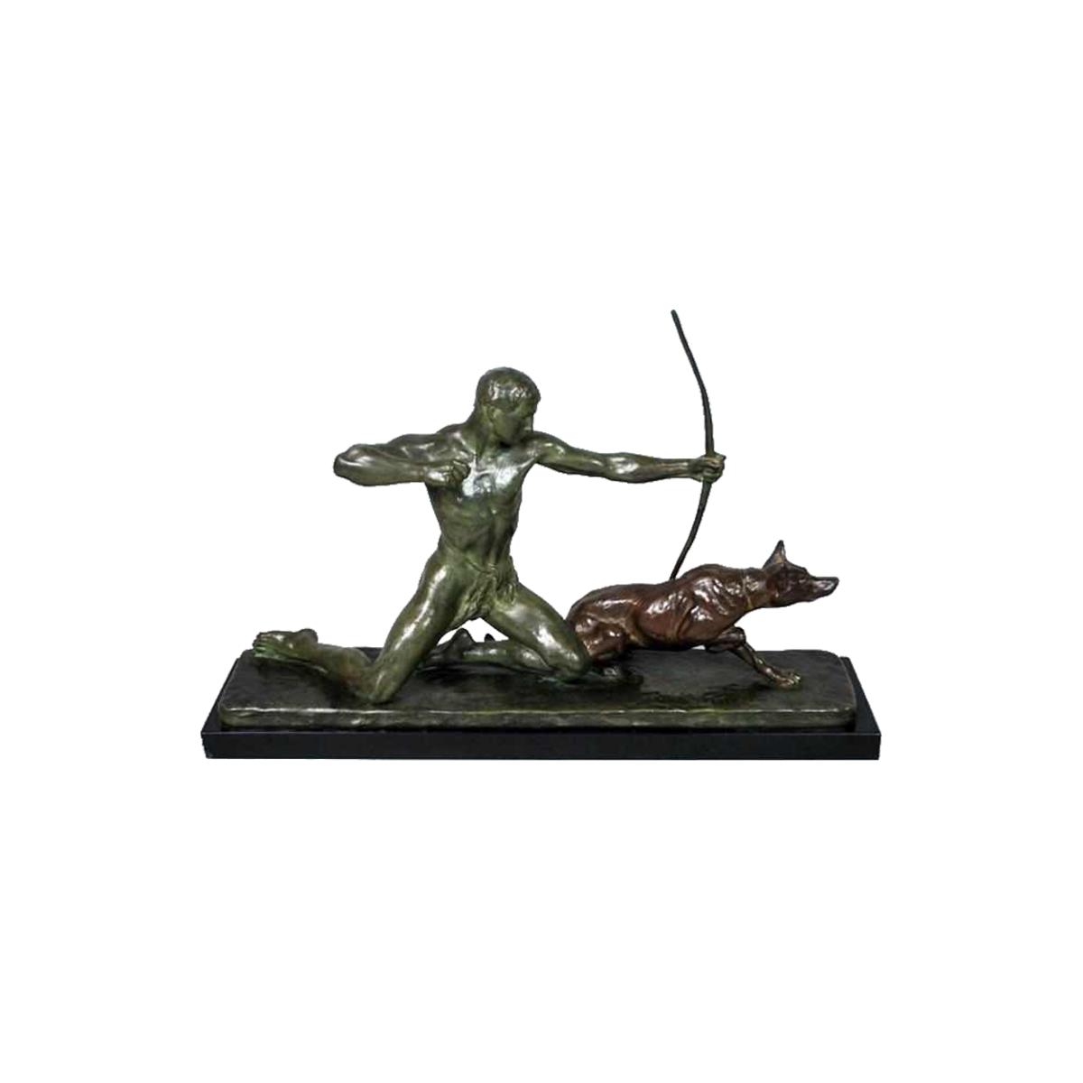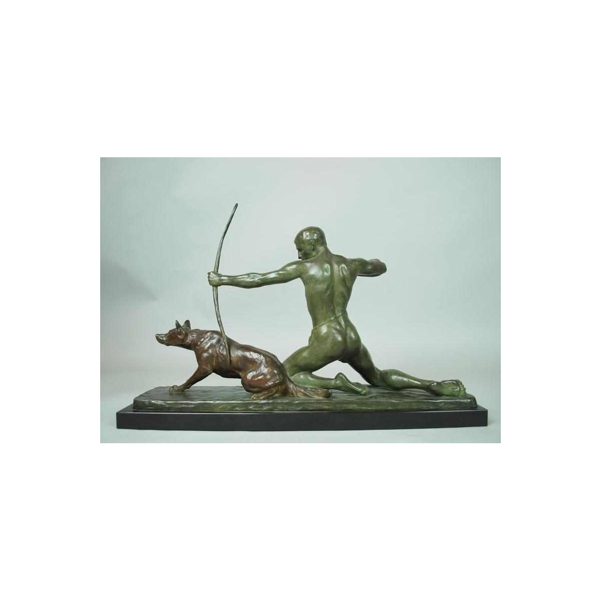 Art Deco bronzen sculptuur van de Franse beeldhouwer Louis Riche, "De jager en zijn hond".