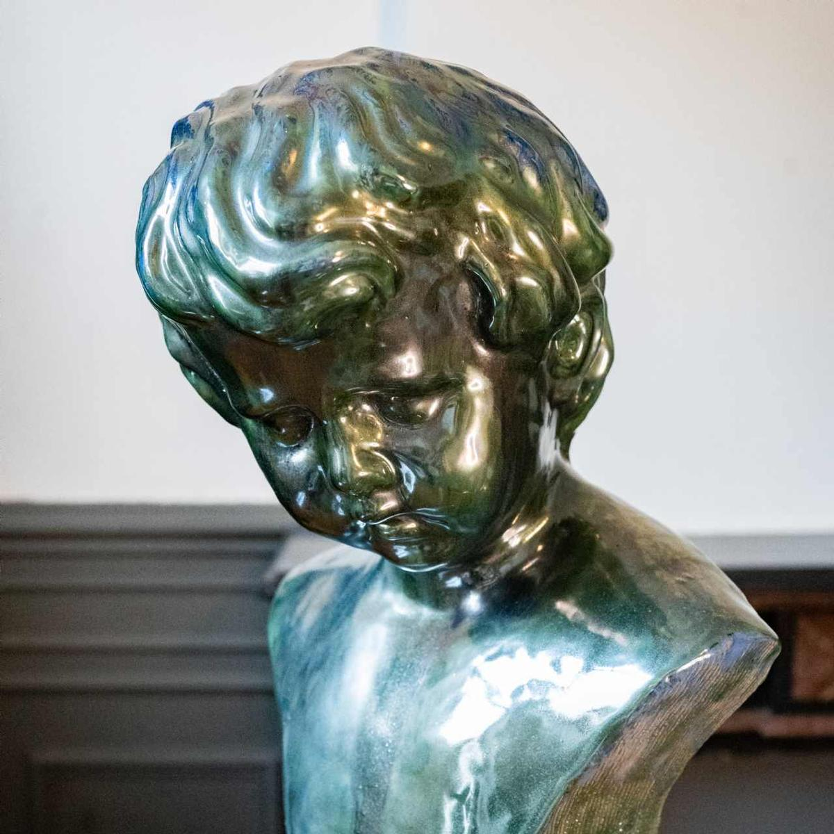 Louis Gustave Cambier & Roger Guérin, sculptuur “Buste van een jonge jongen” gezouten steengoed, Bouffioulx ca 1925