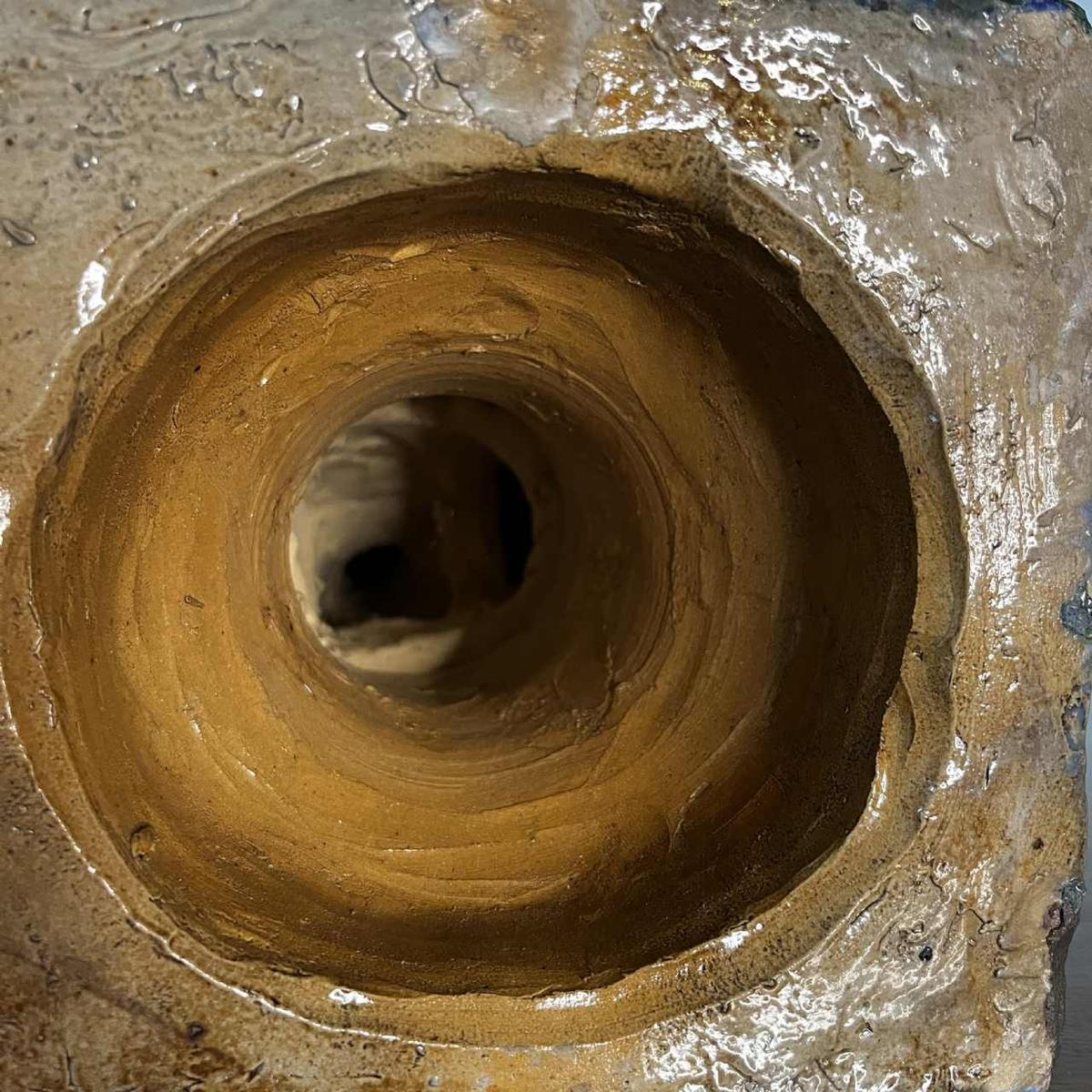 Het licht iriserende blauwgroene glazuur is typisch voor het werk van meesterpottenbakker Roger Guérin. De onderkant van het stuk is ook typisch voor het keramiek van R. Guérin.