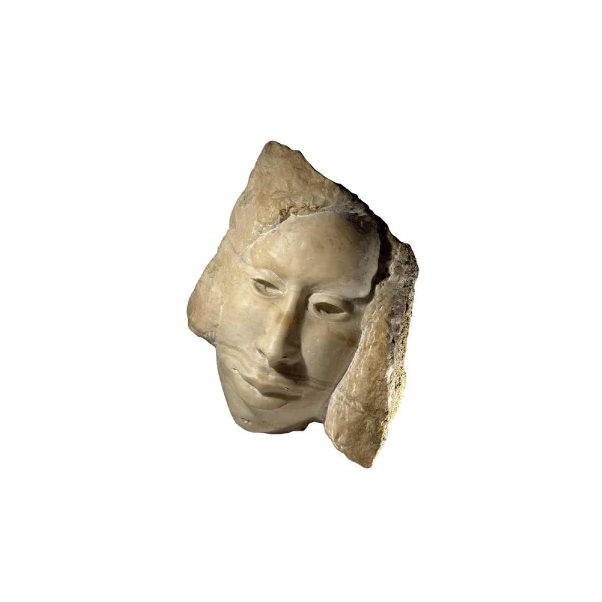 Vrouwenmasker rechtstreeks uit marmer gehouwen, in een stijl die dicht bij de art deco ligt.