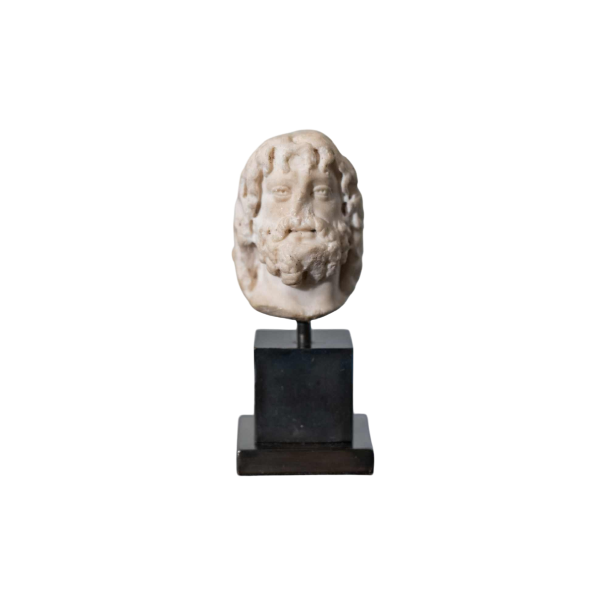 De godheid met haar dat in losse krullen valt en het gezicht omlijst, met een krullende baard en dubbelgeboorde pupillen, klein bevestigingsgaatje bovenaan het hoofd.