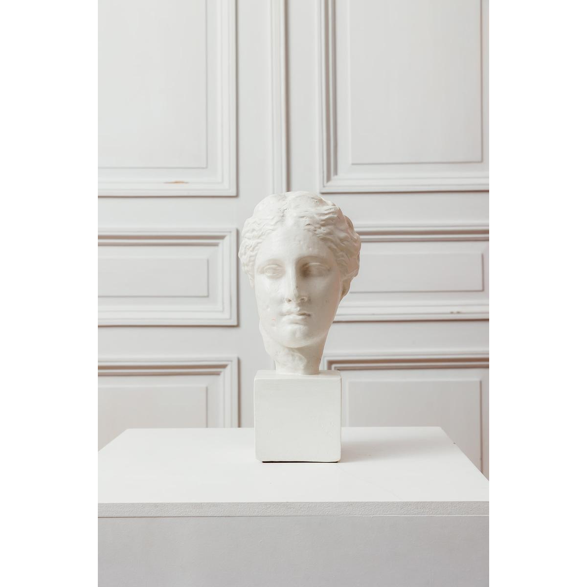 Gipsen reproductie van het hoofd van Hygieia, een figuur uit de Griekse mythologie die geassocieerd wordt met gezondheid en harmonie. Fijne gelaatstrekken, geknoopt haar en een evenwichtige vormgeving, rustend op een eenvoudige kubusvormige sokkel.