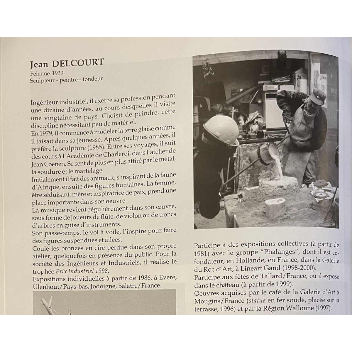 Jean Delcourt werd in 1939 in België geboren. Hij werkte als industrieel ingenieur en bezocht een twintigtal landen. Hij schilderde in die tijd, deze discipline vereiste weinig materiaal. In 1979 begint hij met het modelleren van klei zoals hij dat in zijn jeugd deed. Daarna wendt hij zich tot de beeldhouwkunst (1985). Tussen zijn reizen door volgt hij cursussen aan de Academie van Charleroi, in het atelier van Jean Coenen, en voelt hij zich steeds meer aangetrokken tot metaal, lassen en hameren. De vrouw, een verleidelijk wezen, moeder en inspirator van de vrede, alsook de muziek nemen een belangrijke plaats in in zijn werk (fluitspelers, violisten of boomstammen als instrumenten). Zijn hobby, zweefvliegen, inspireert hem tot het maken van hangende en gevleugelde figuren.