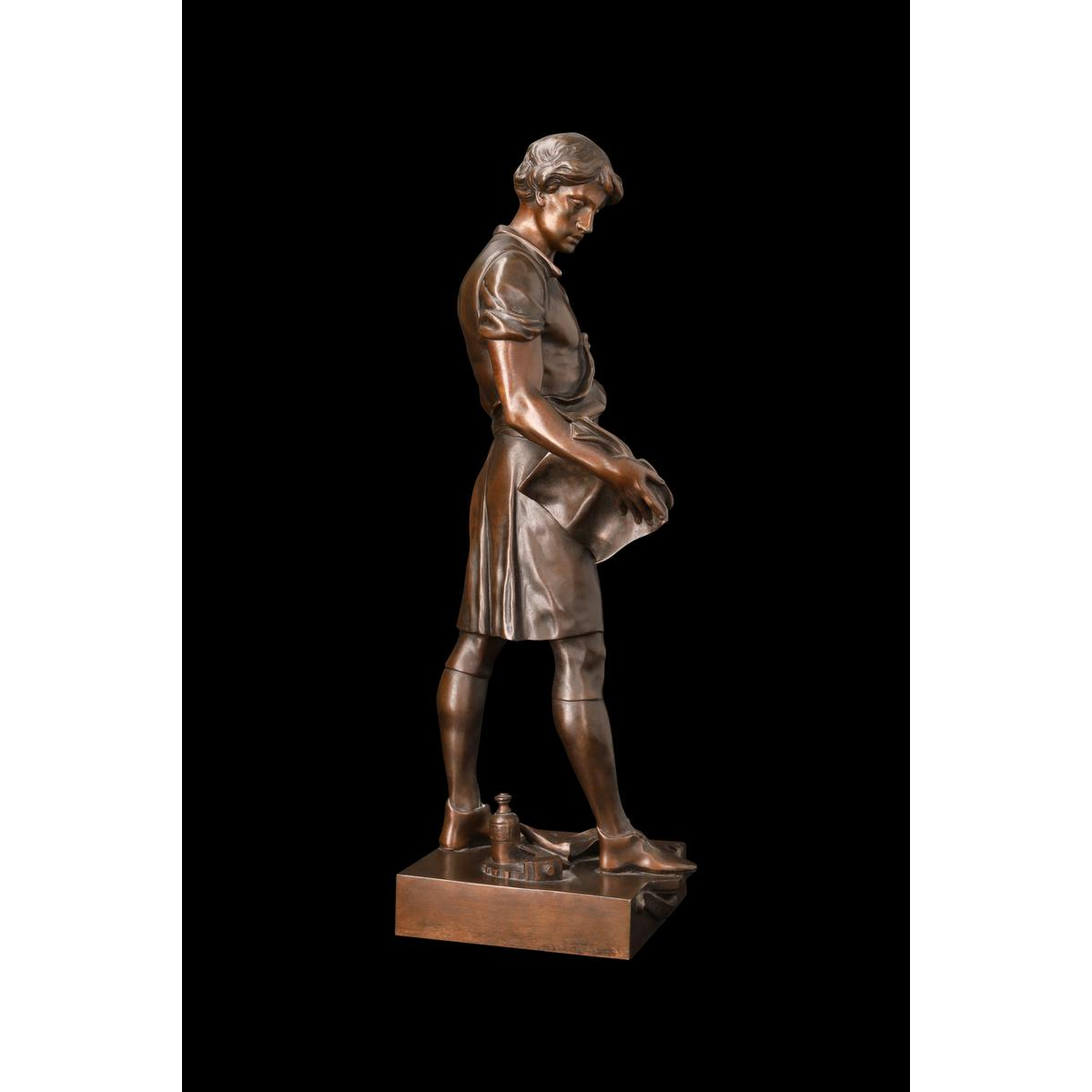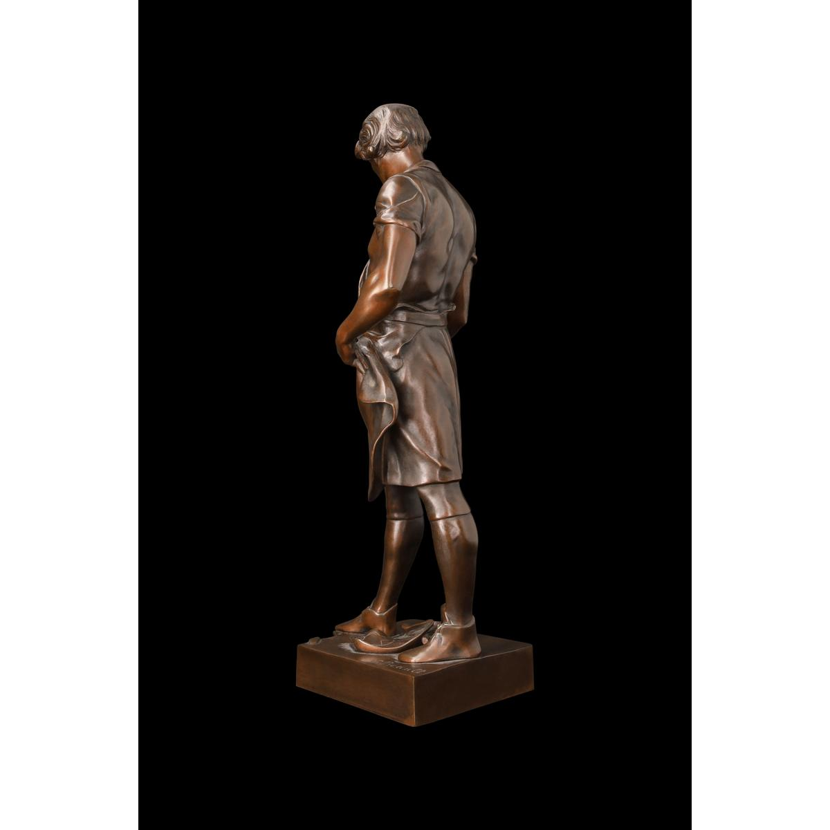 Het werk stelt een jonge, atletische, staande mannelijke figuur voor, gekleed in een schort of eenvoudige werkkleding, wat wijst op een ambachtsman of arbeider.