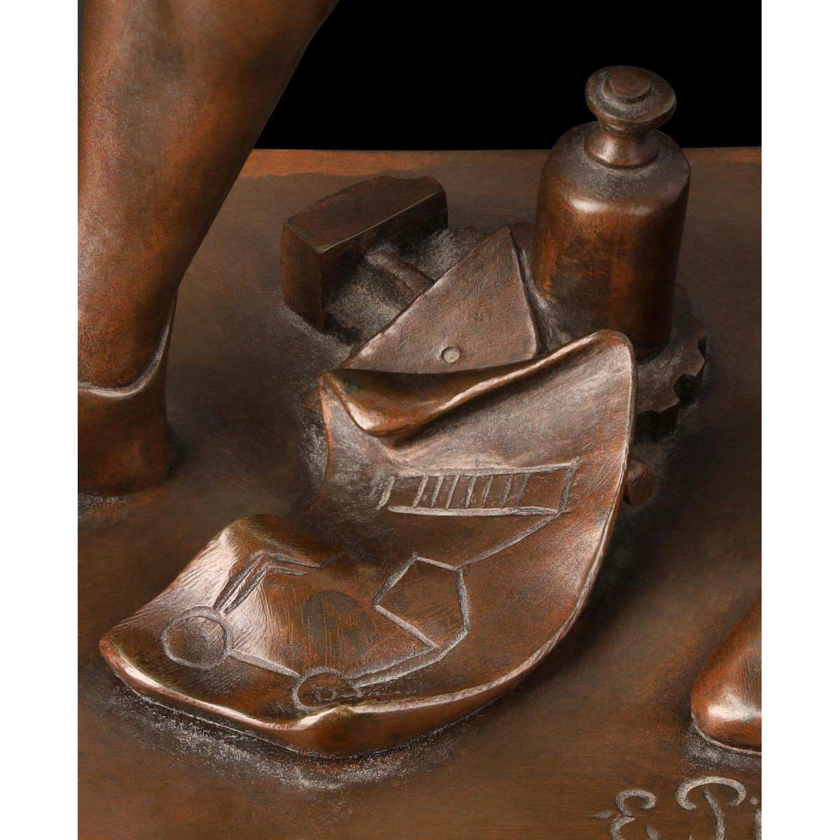 Sokkel en Symboliek: Het personage staat op een sokkel waarop gereedschappen en symbolen van vooruitgang en arbeid zijn geplaatst, zoals tandwielen, een olielamp (symbool van kennis of verlichting), en een hamer.