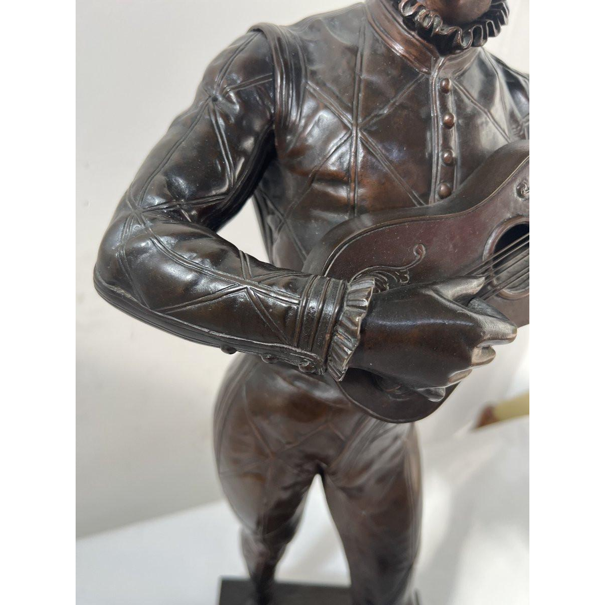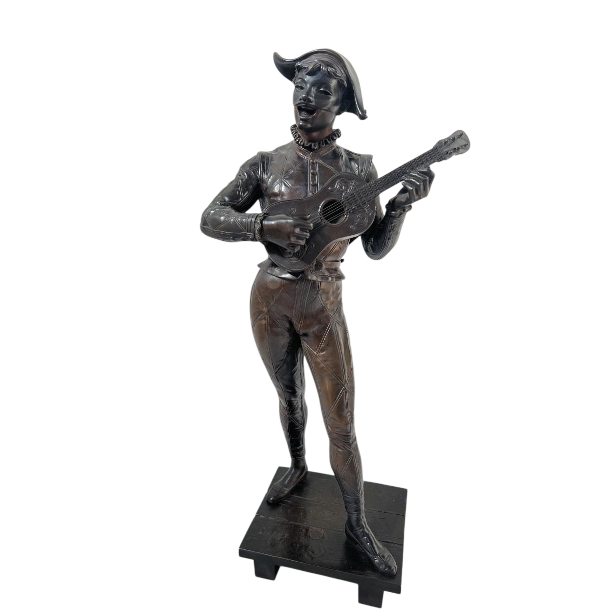 "De muzikant Harlekijn" die gitaar speelt, bronzen groep met bruine patina van Debut Marcel.