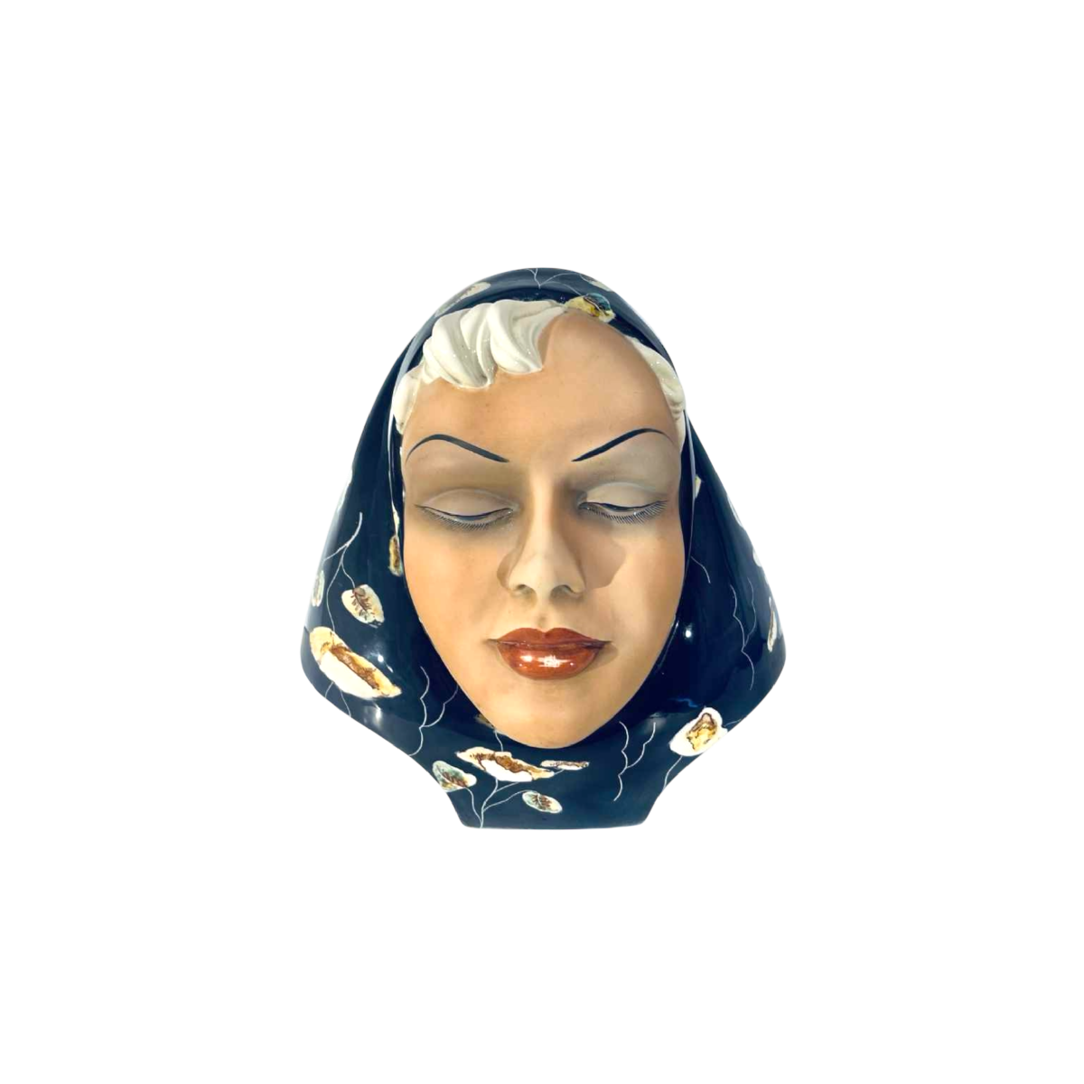 TRIART BASSANO Bustesculptuur 'Gezicht van een vrouw met sluier', polychroom Art Deco keramiek, ca. 1940