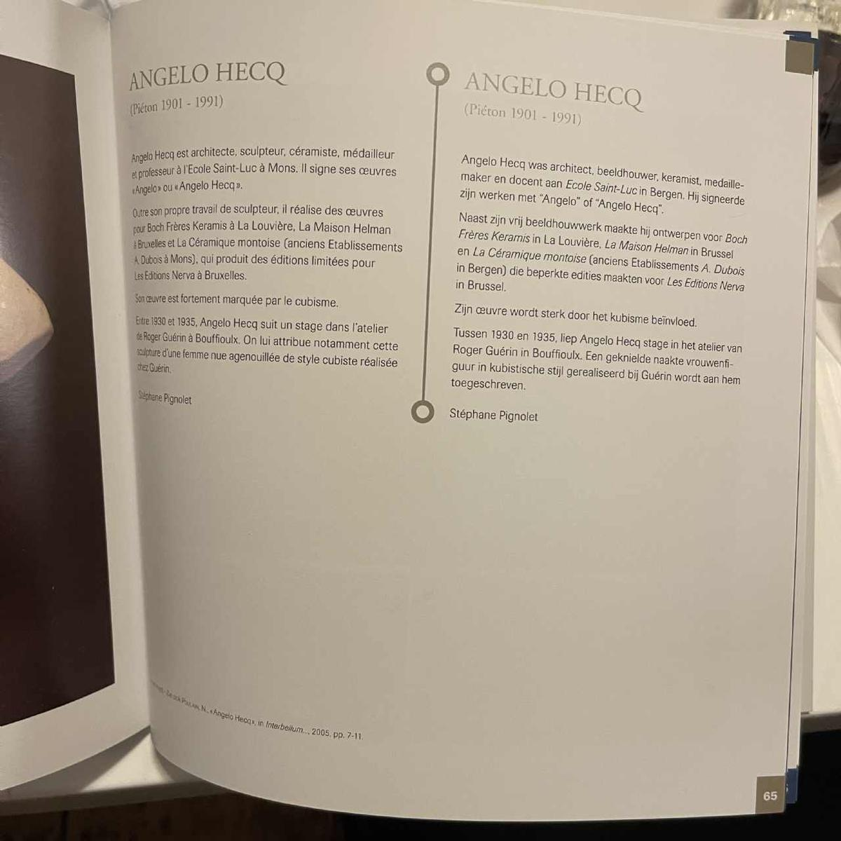 Angelo Hecq is architect, beeldhouwer, keramist, medailleur en leraar aan de Ecole Saint-Luc in Bergen. Hij signeert zijn werken met “Angelo” of “Angelo Hecq”.