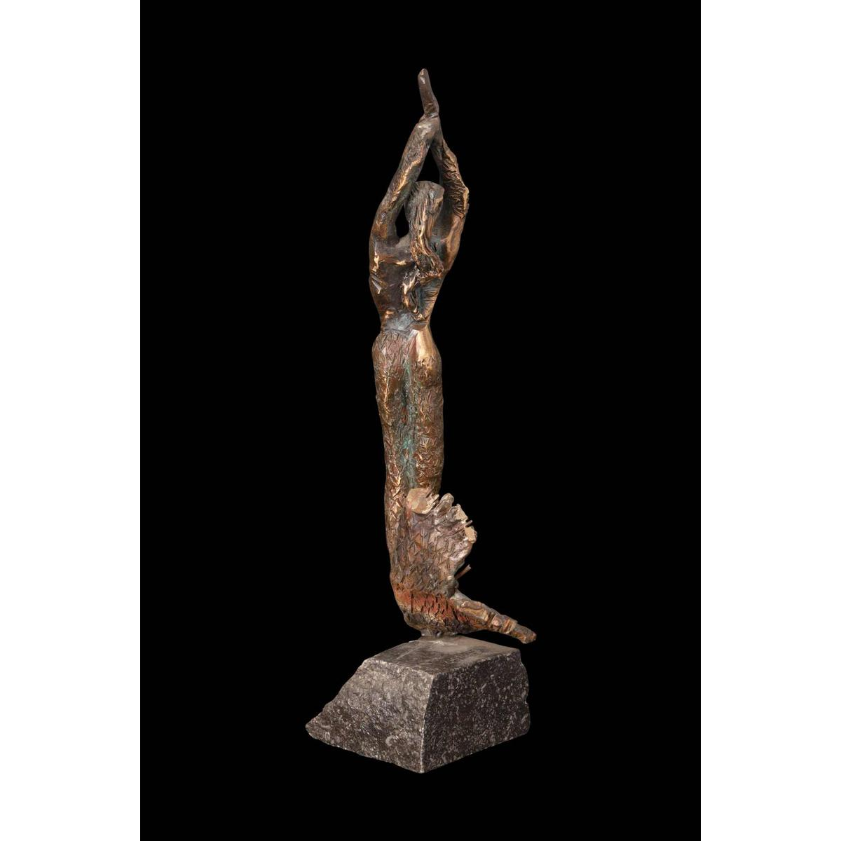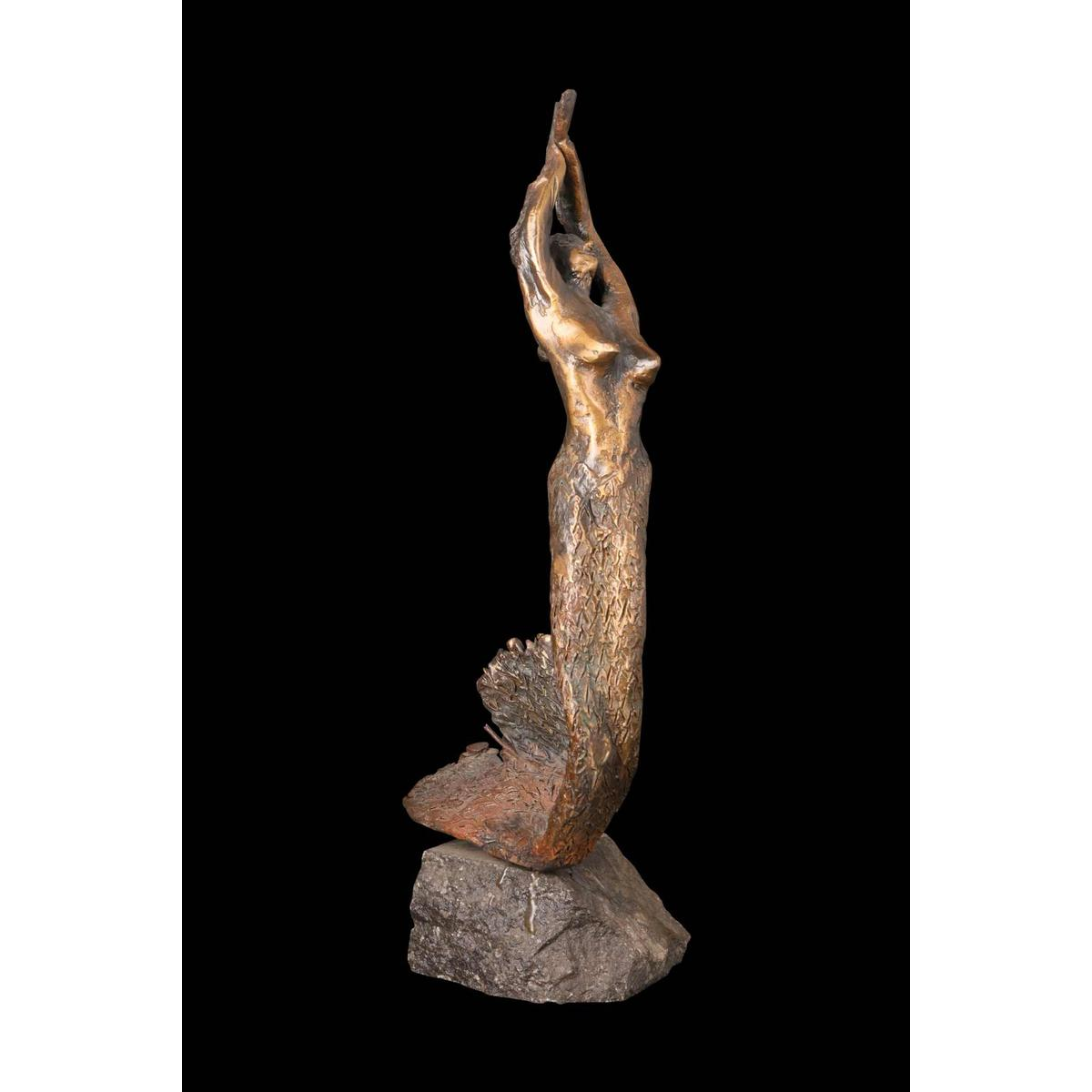 Dit fascinerende beeld stelt een slanke zeemeermin voor die verticaal oprijst uit de ruwe stenen basis, haar armen opgeheven en gekruist boven haar hoofd.