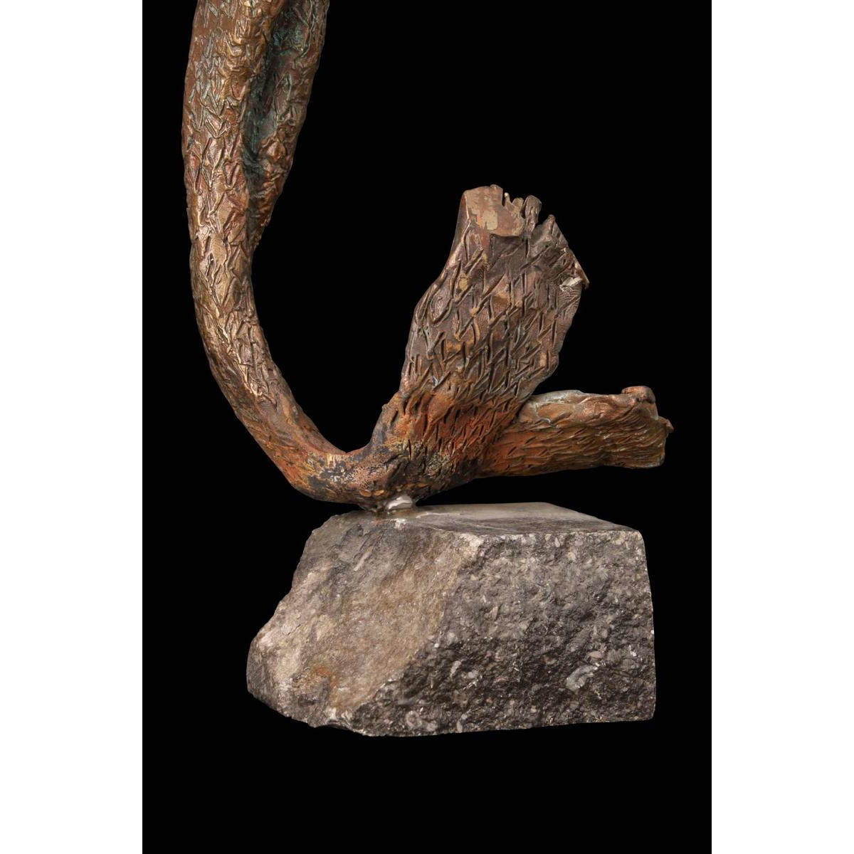 De behandeling van het brons, met zijn warme, geoxideerde patina, accentueert de contrasten van licht en materiaal.