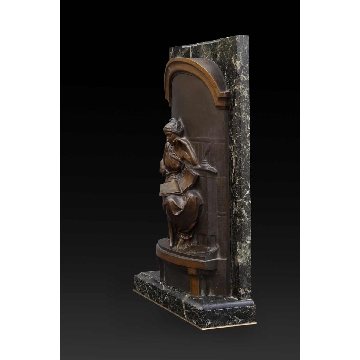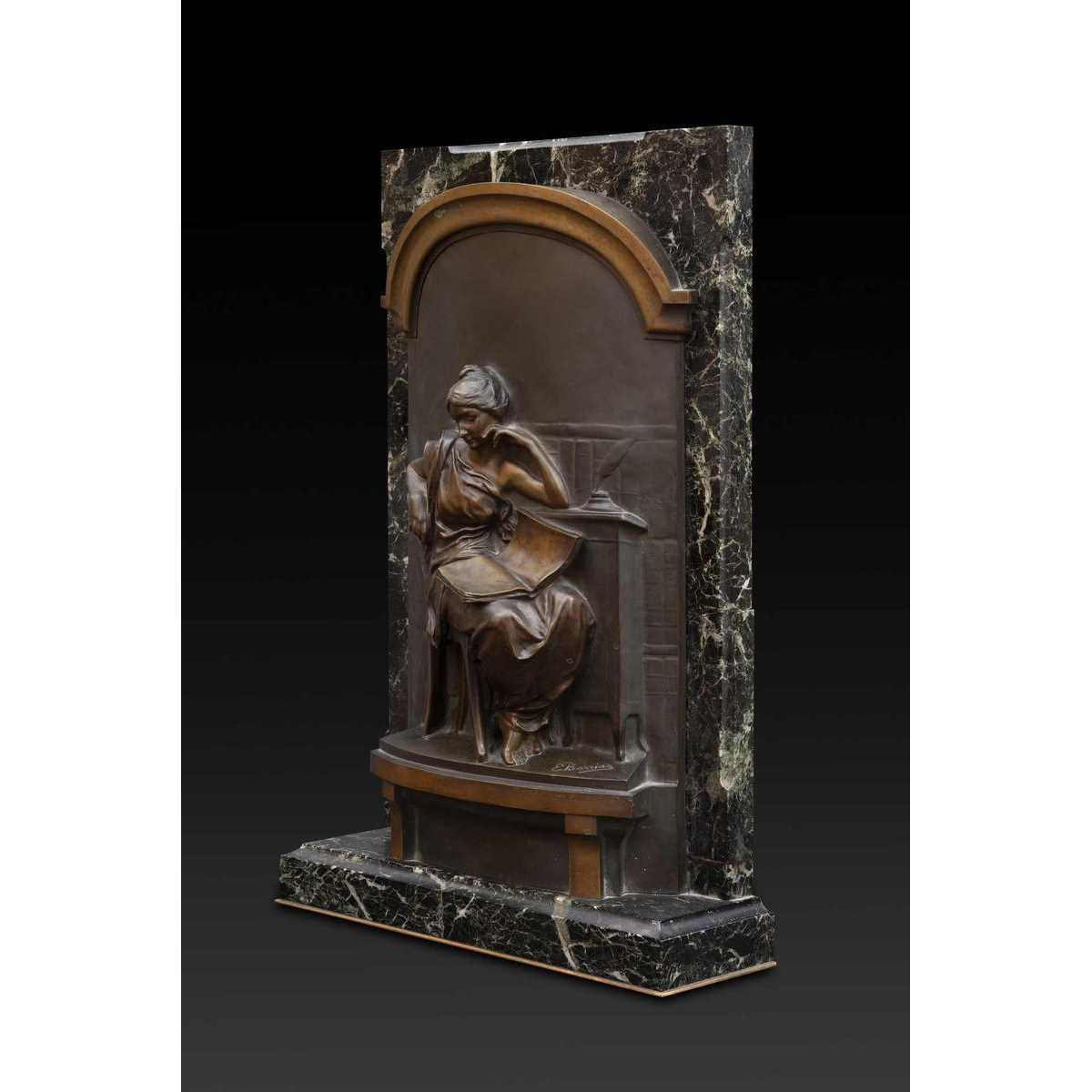 De basis en het frame van het bas-reliëf zijn gemaakt van geaderd zwart marmer, wat elegant contrasteert met het brons van het reliëf en een vleugje verfijning en rijkdom toevoegt aan het werk.