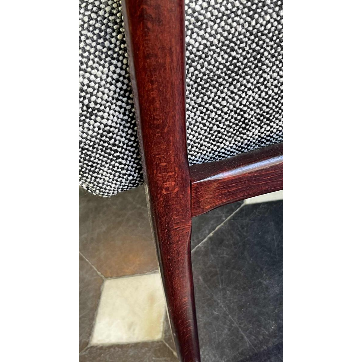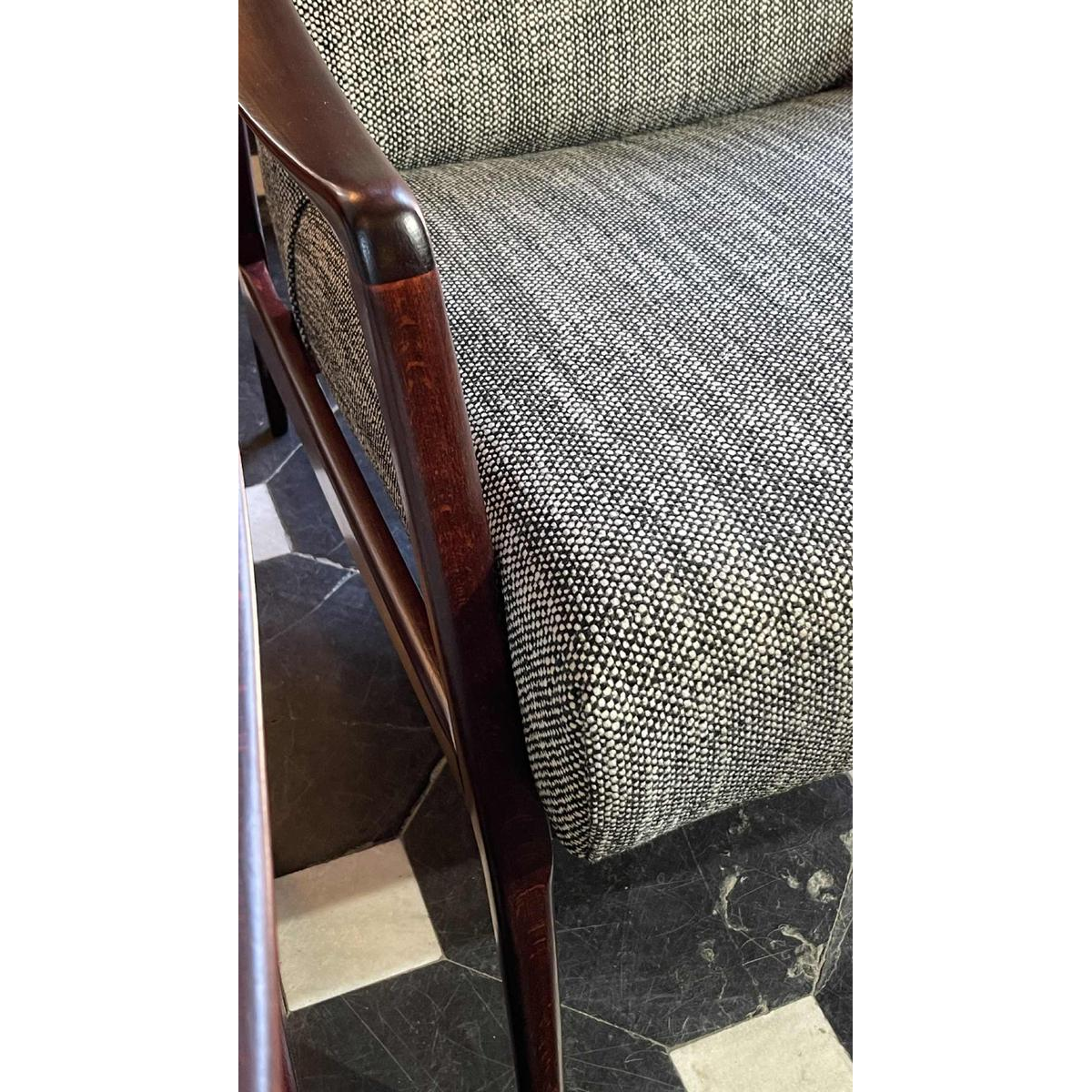 Paar vintage fauteuils uit de jaren 50. Sober Scandinavisch ontwerp, in de stijl of van Arne Vodder, zeer comfortabel. Volledig gerestaureerd, zitstructuur gedemonteerd en opnieuw gemonteerd (geschroefd en gelijmd), nieuwe bekleding, kwaliteitsstof en gelakt mahonie gebeitst beukenhout. Zithoogte: 42 cm. Om weg te nemen of te leveren...